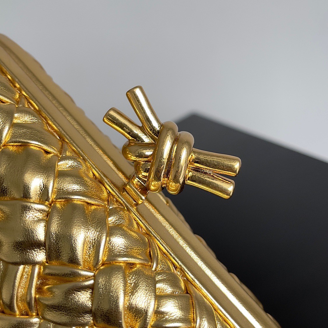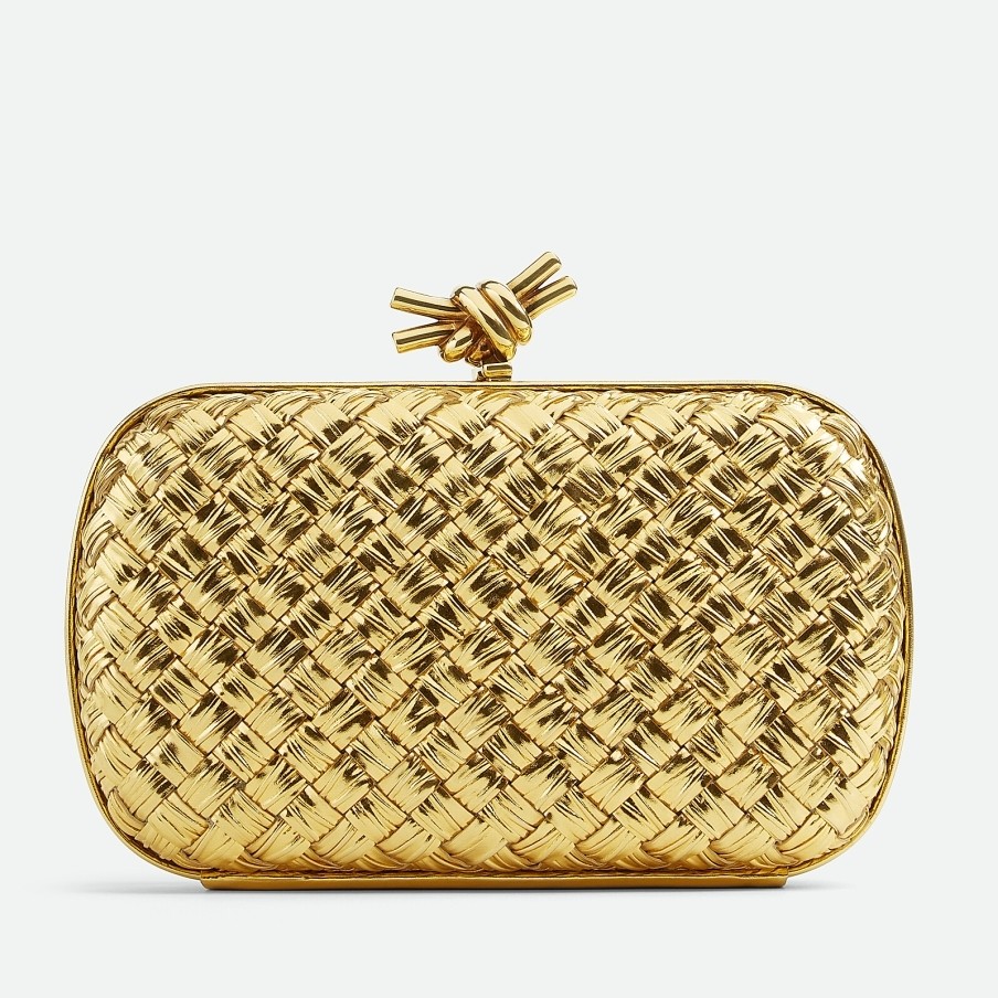 Bottega Veneta Knot Minaudiere Clutch In Gold Intreccio laminated Leather