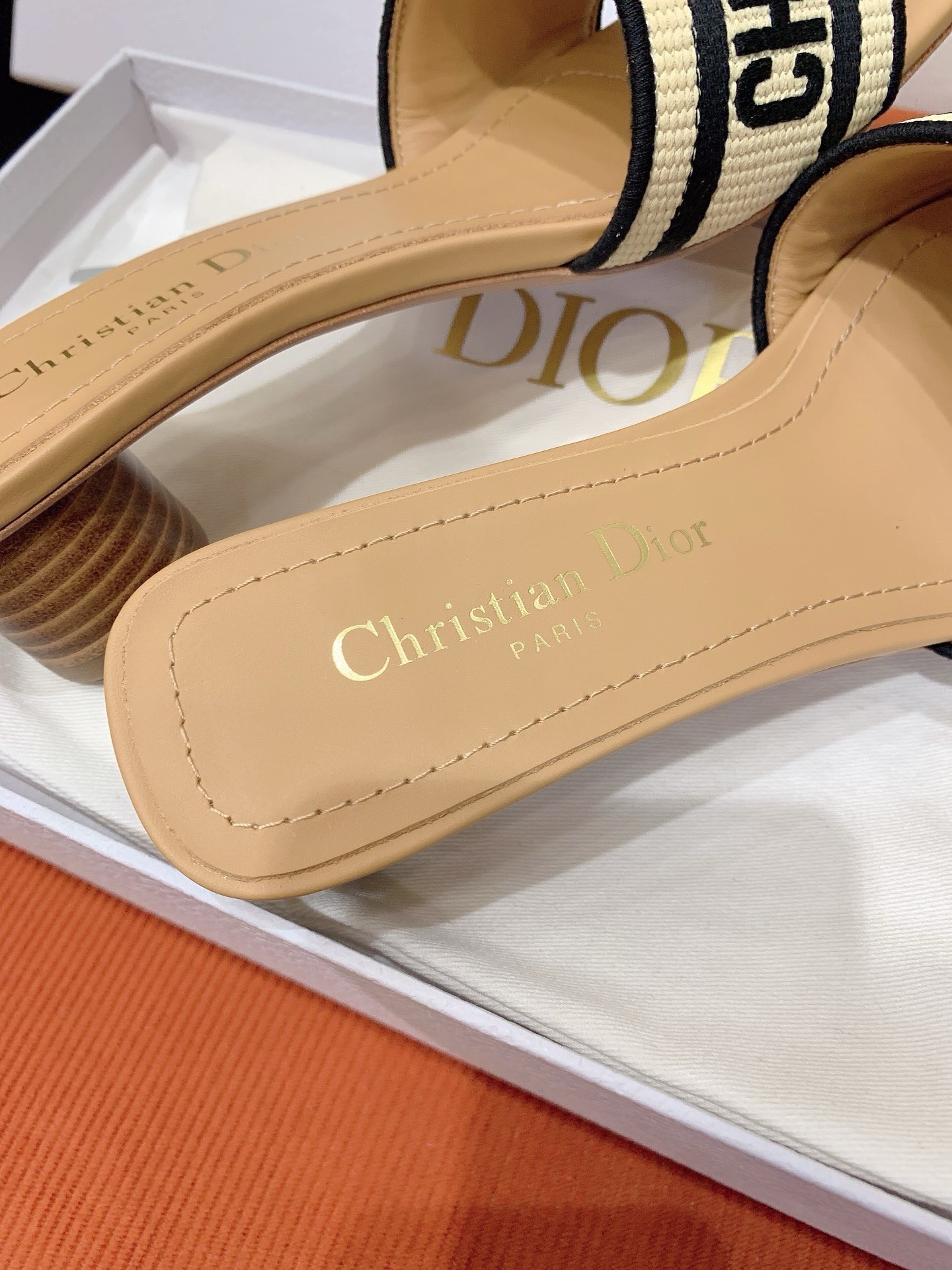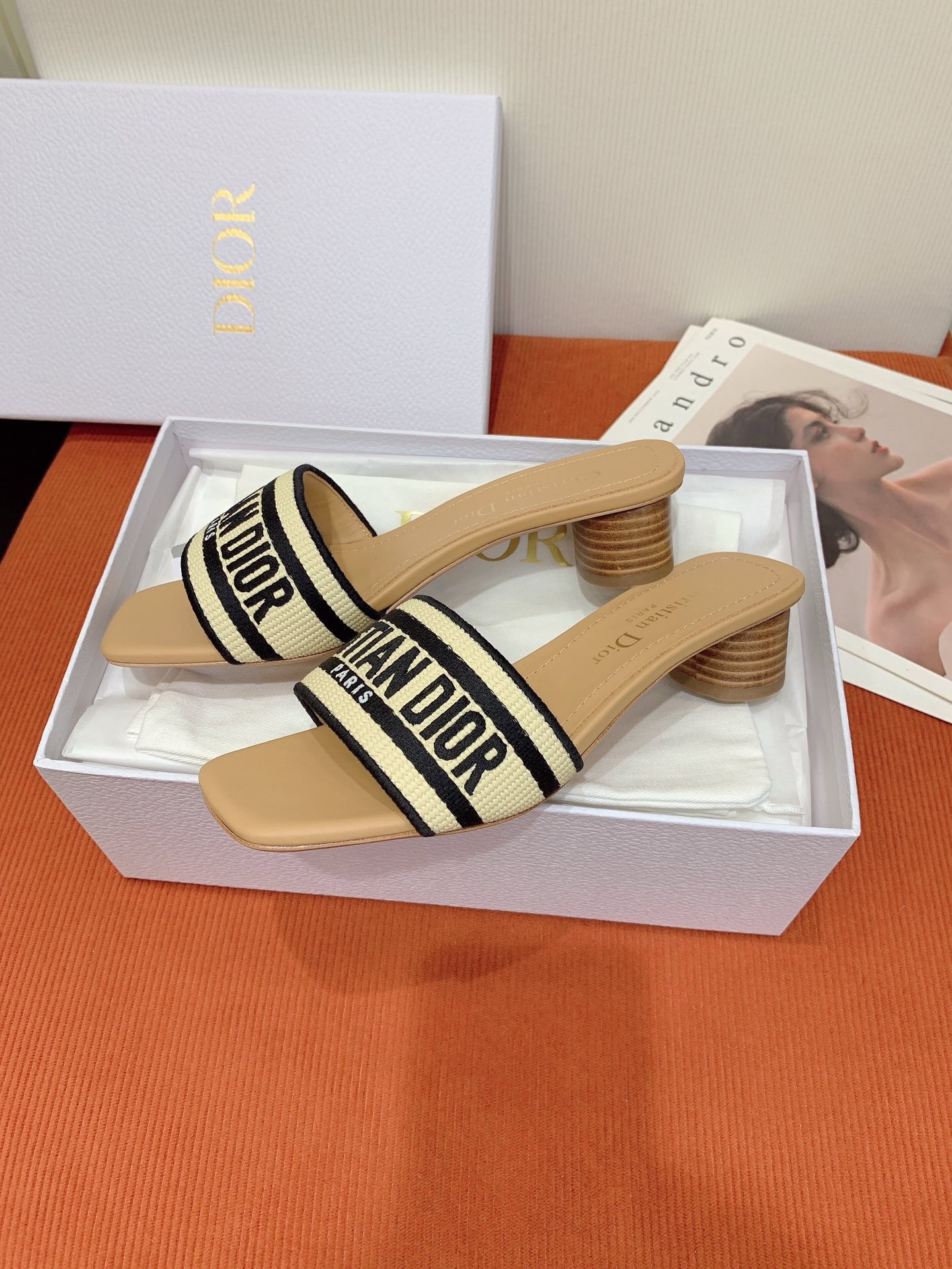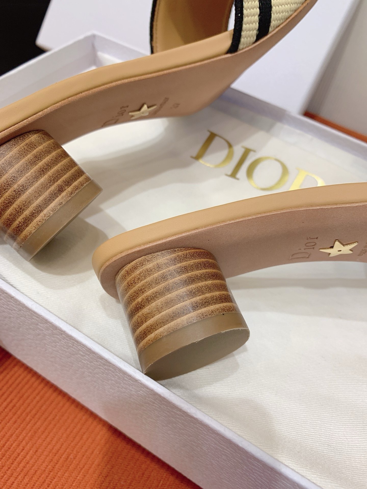 Dior Dway Heeled 35MM Slides in Natural Raffia and Embroidered Cotton