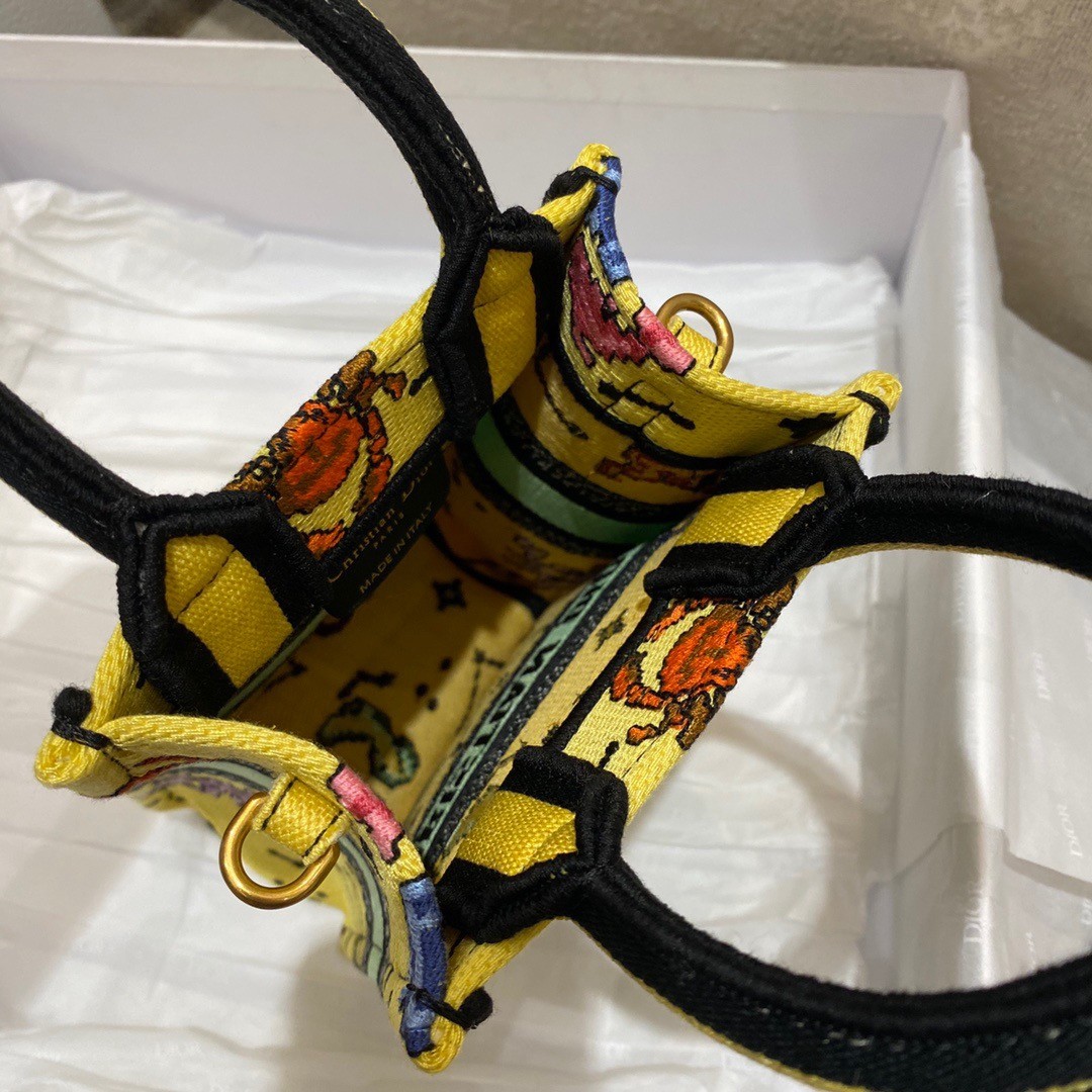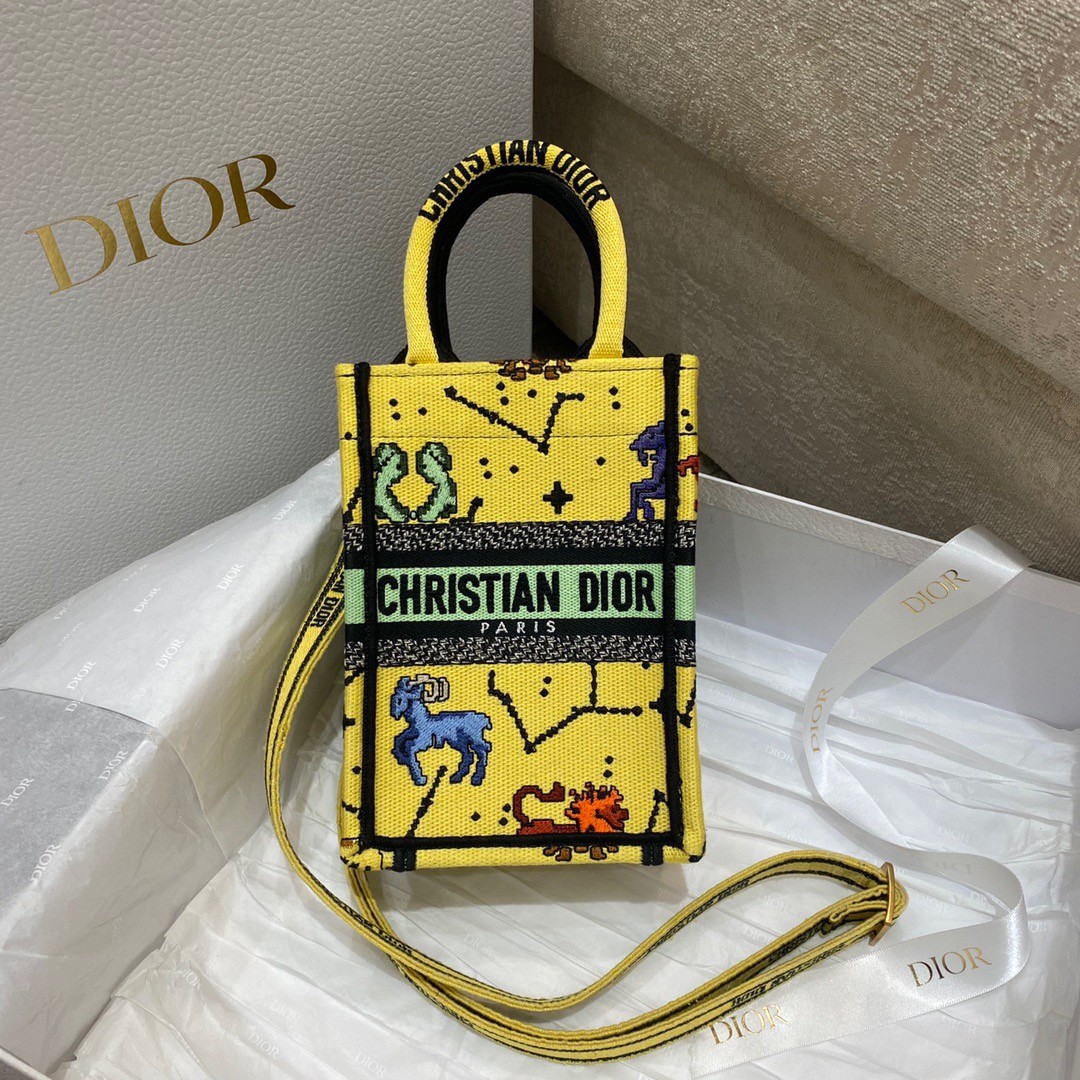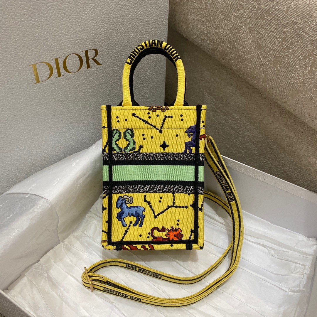 Dior Mini Book Tote Phone Bag In Yellow Pixel Zodiac Embroidery