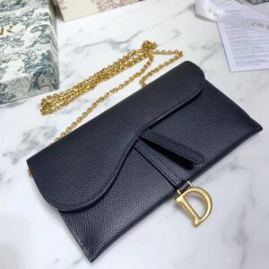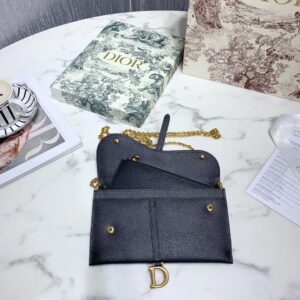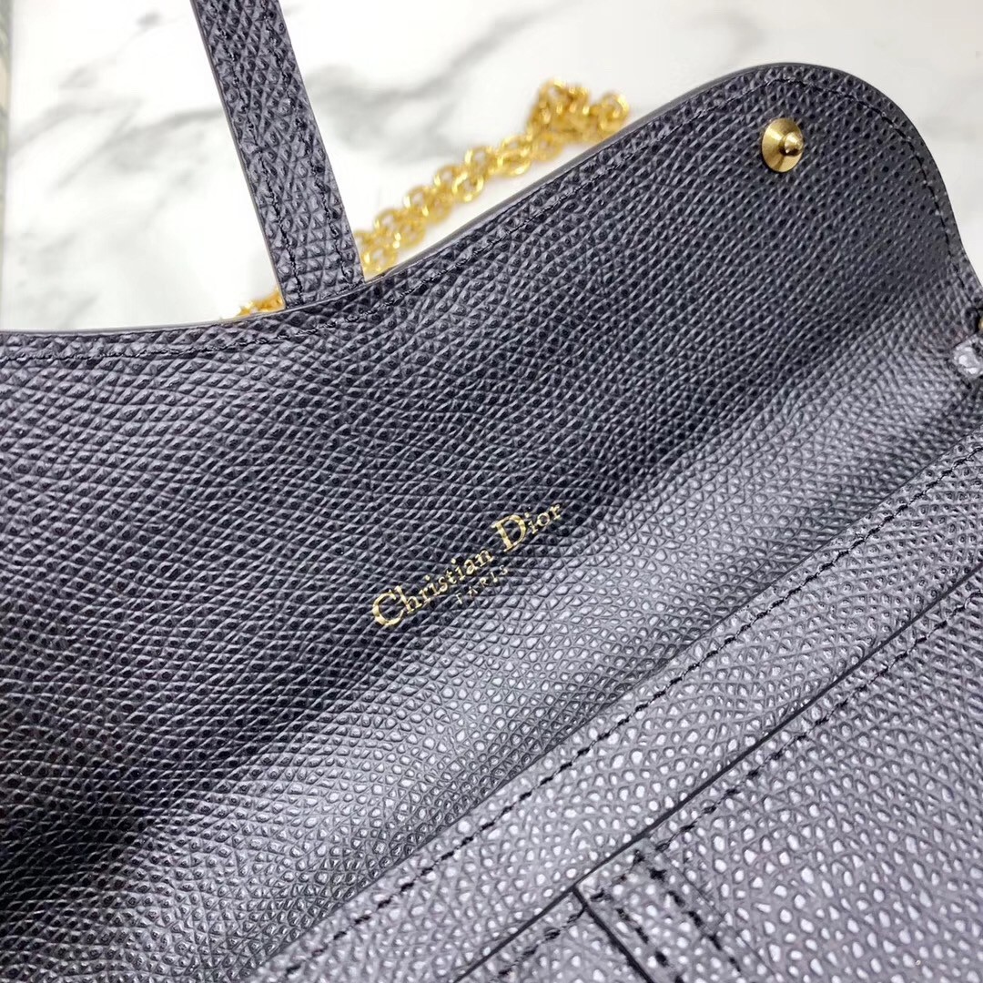 Dior Saddle Chain Wallet In Black Grained Leather