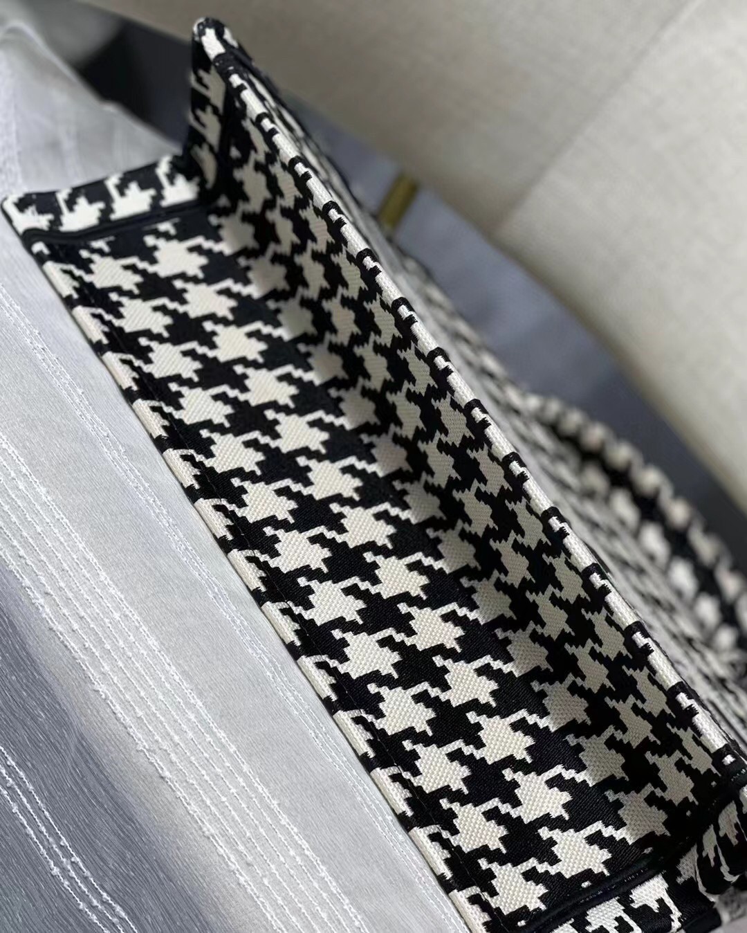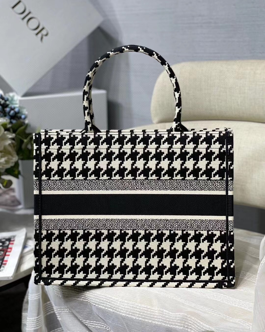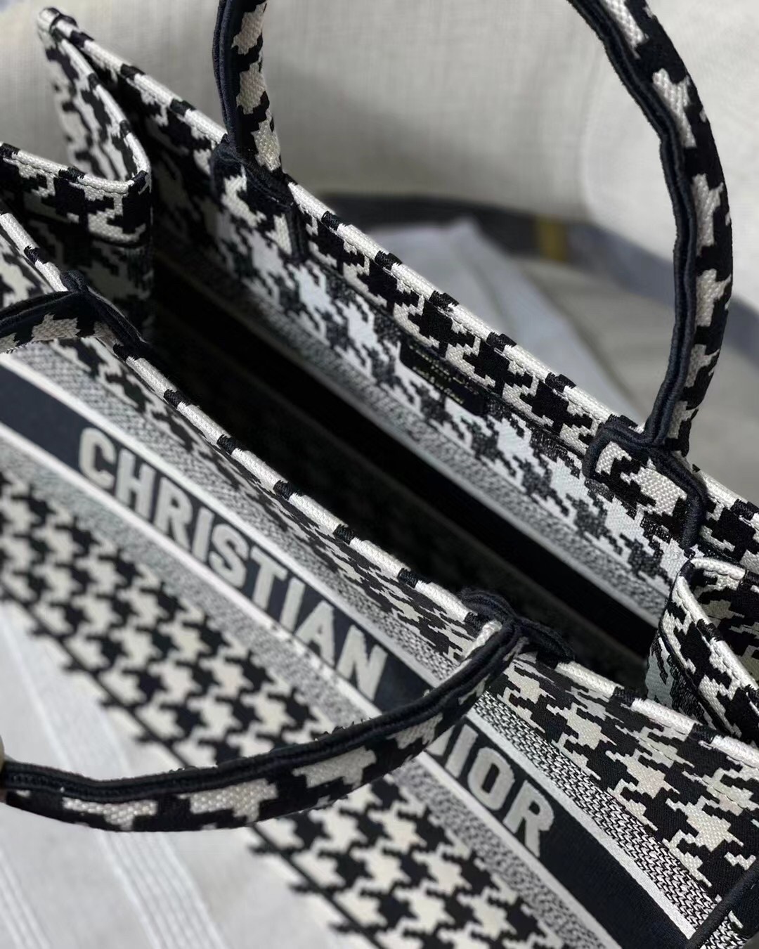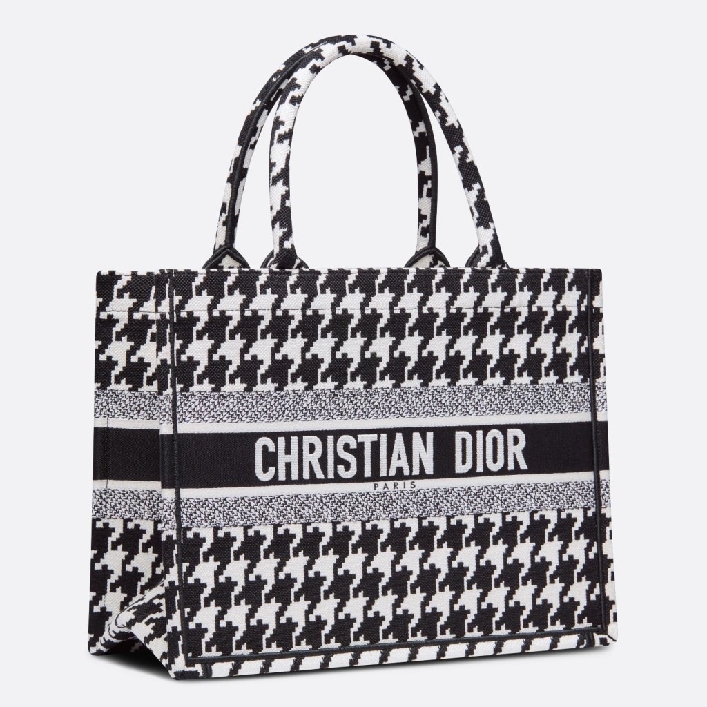 Dior Small Book Tote In Black Houndstooth Embroidery