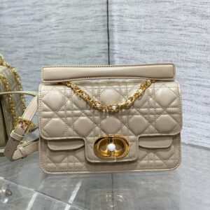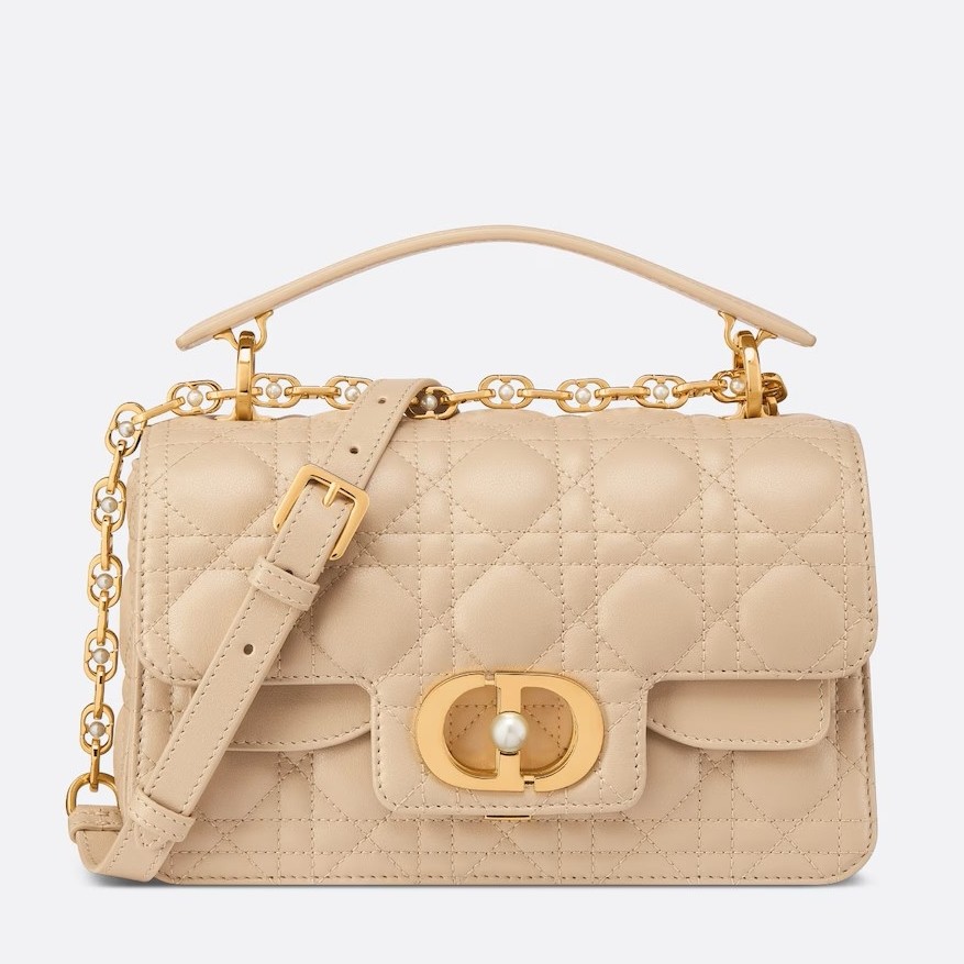 – Removable and adjustable chain shoulder strap with white resin pearls and leather insert