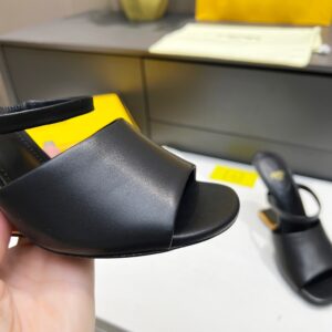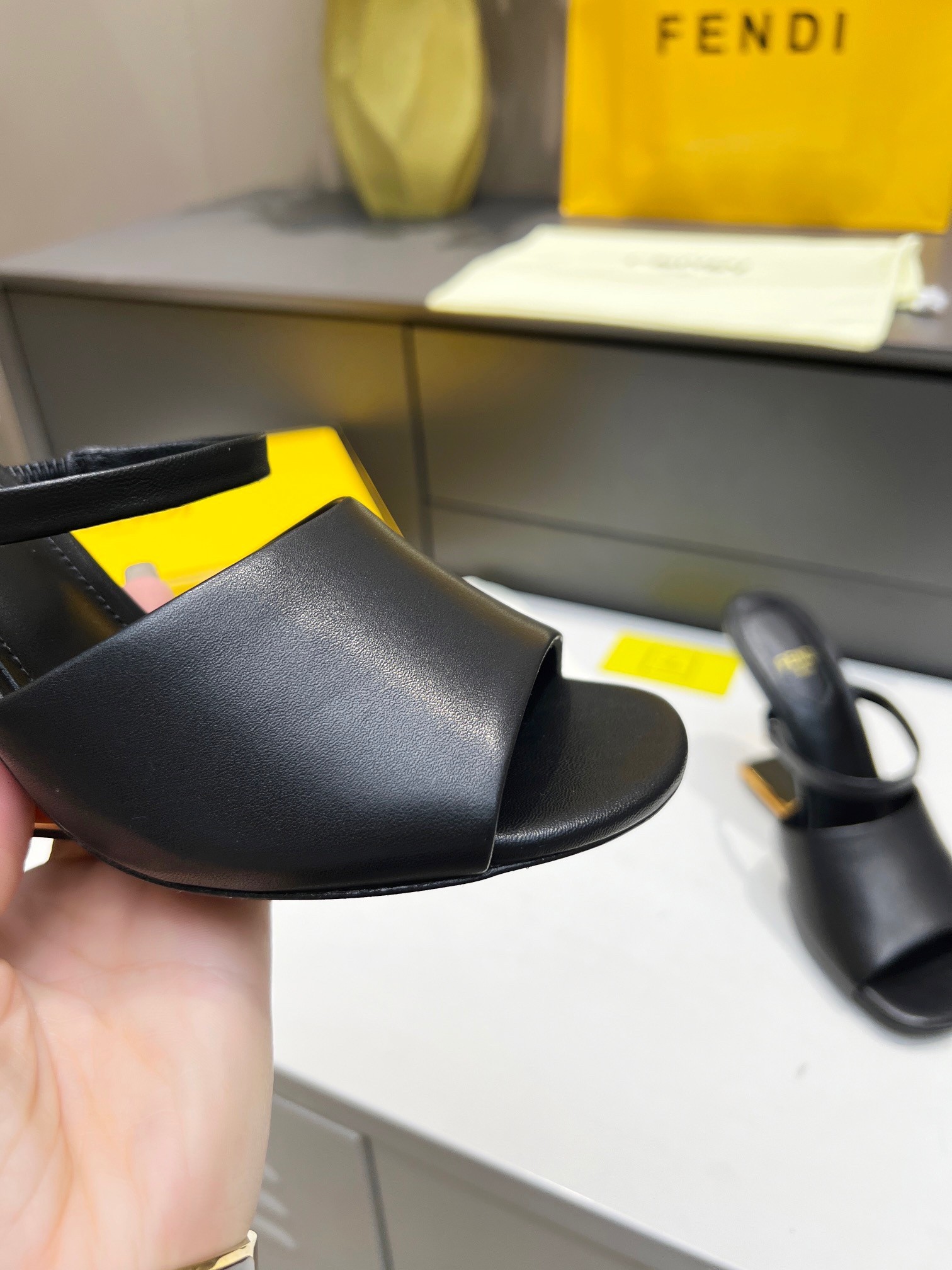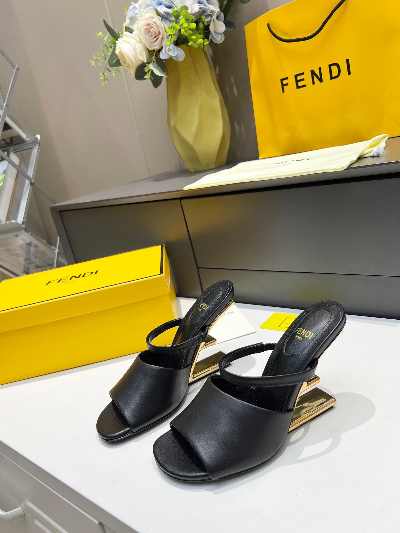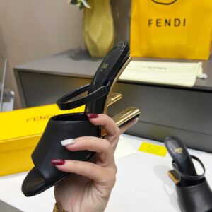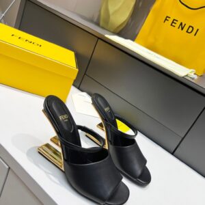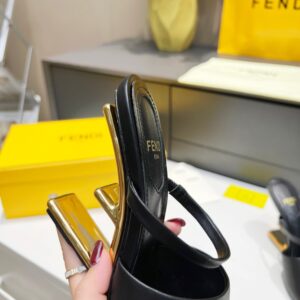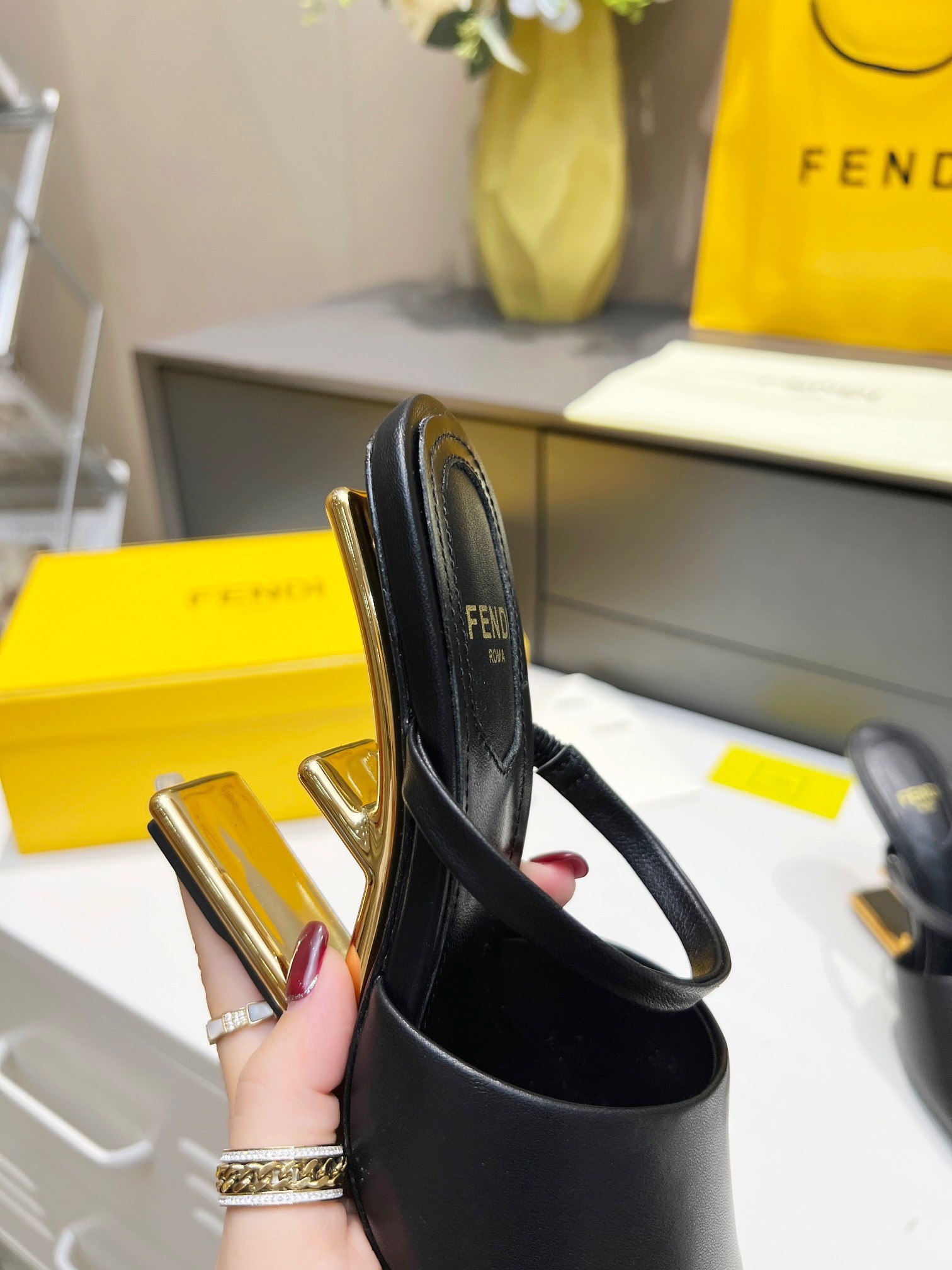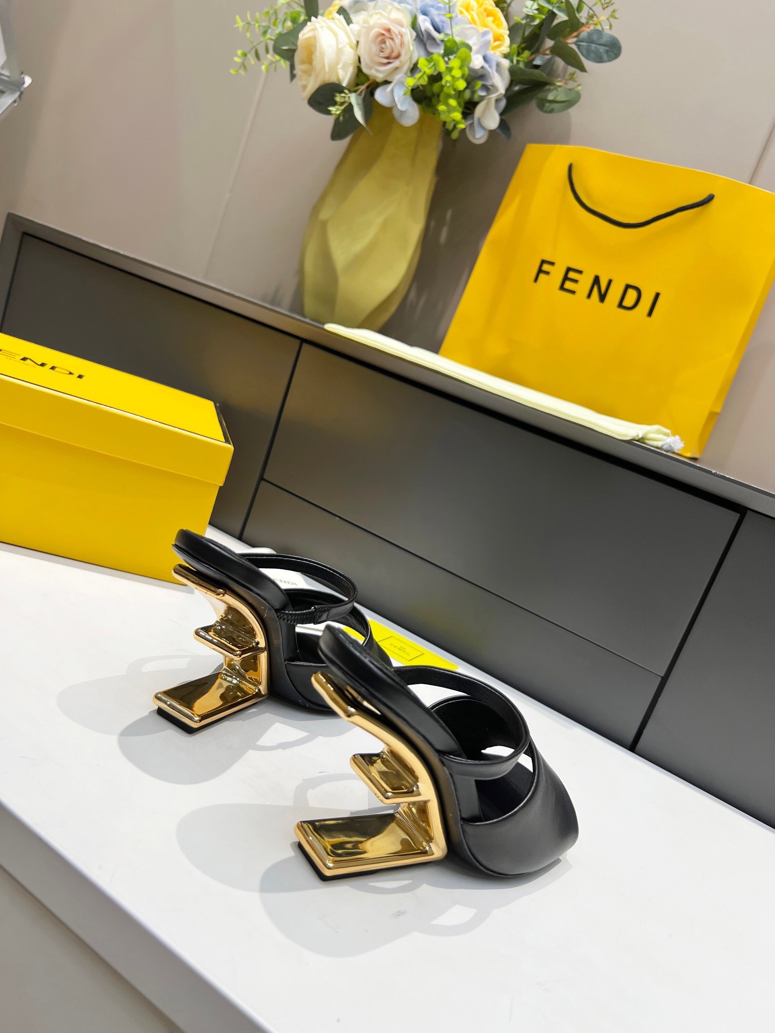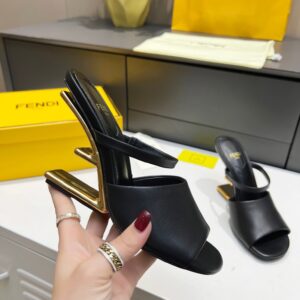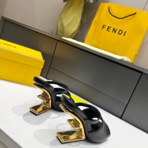 – Diagonal F-shaped sculpted heel in gold-colored metal