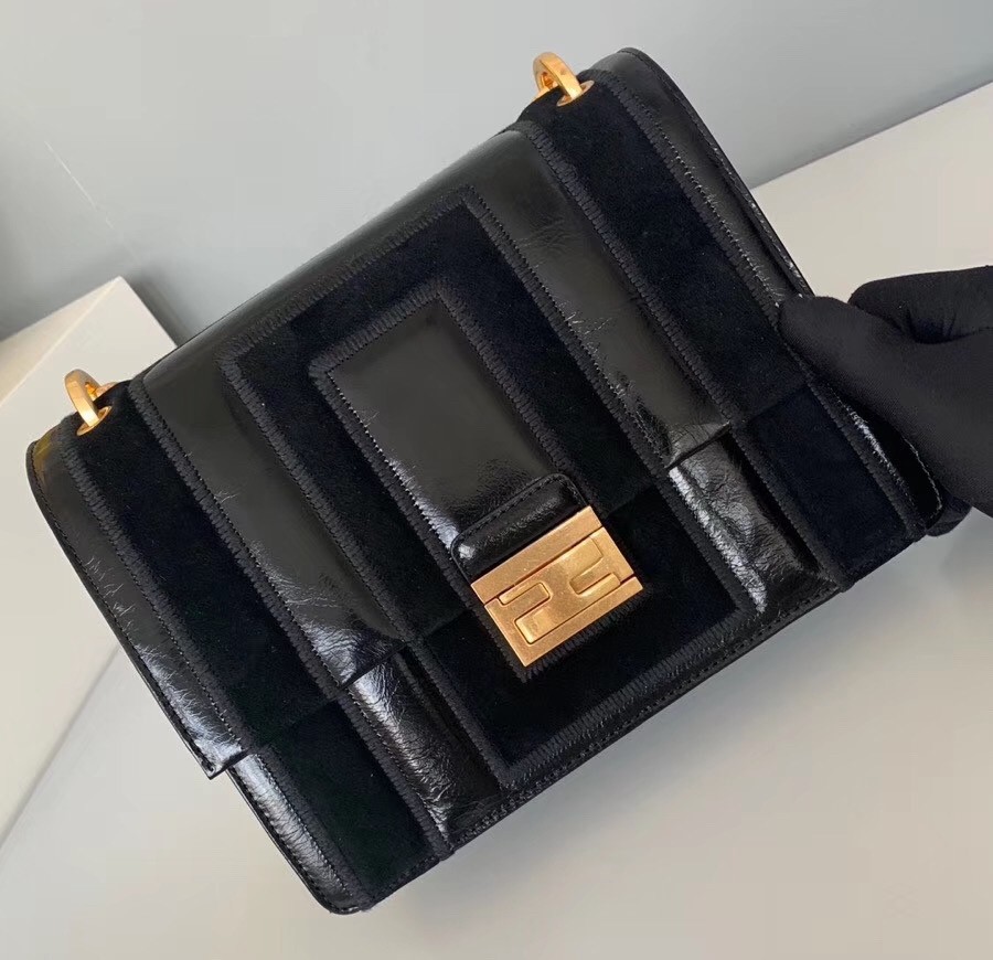 – Geometric flap with embossed corners and an iconic FF press-stud fastening