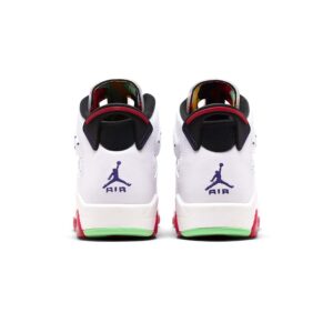 The Air Jordan 6 “Hare” is a Spring 2020 release that features overtures to another classic Jordan shoe: the original Air Jordan 7 “Hare.” Famously appearing on the feet of Bugs Bunny during the early ’90s television commercials with Michael Jordan, the “Hare” Jordan theme returns with a modern twist as Jordan Brand honors the legacy of “The GOAT’s” sneaker collection. White leather overlays contrast the light grey perforated synthetic nubuck base that appears on the mid-panel and toe. A red neoprene lace cover with a black Jumpman logo sits just below the clear rubber tongue that reveals the multicolor geometric pattern found on the Jordan 7’s tongue underneath. An orange and green lace-lock that resembles a carrot adds the final special touch for the upper, while red translucent rubber highlights the sole.