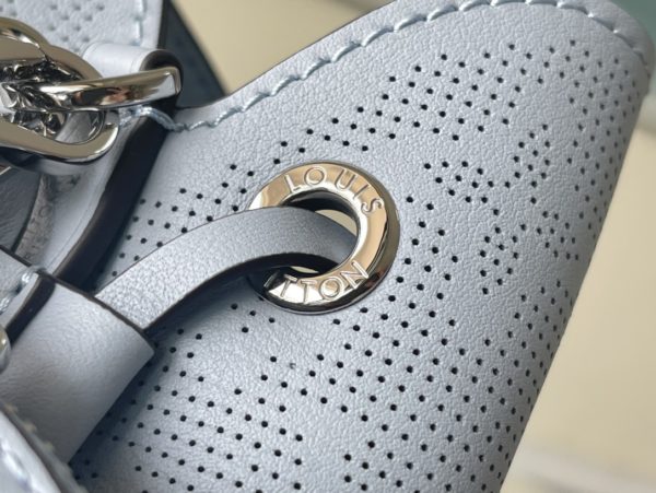 This Bella bucket bag with coin purse is made of Mahina calfskin with a plain weave and Monogram floral pattern surrounded by more than 60,000 custom perforations. Tonal leather trim and hardware complete the overall design. Finished with braided handles and an adjustable, detachable leather shoulder strap.