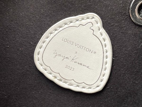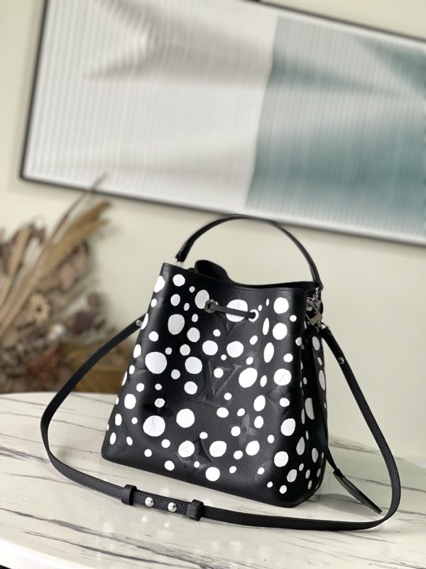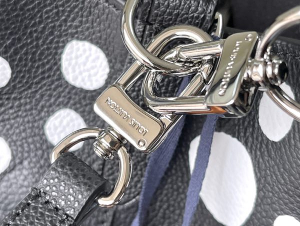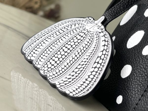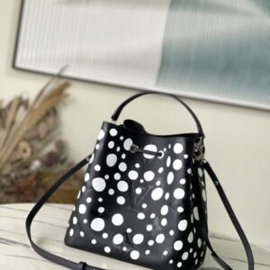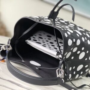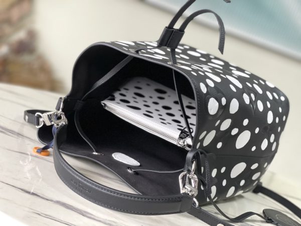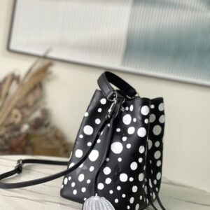 Top layer leather black dot LV x YK NéoNoé BB handbag is from the x Yayoi Kusama cooperation series, condensing the creative energy of the infinite wave point world. Monogram embossed calfskin reflects Yayoi Kusama’s signature polka dots, and the detachable pumpkin-shaped decoration adds the artist’s visual calling card.