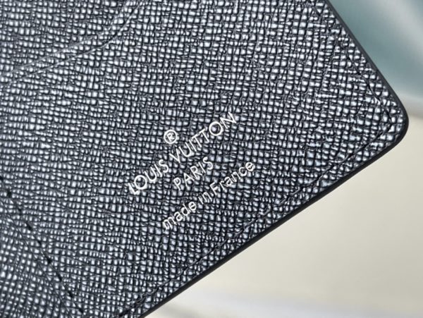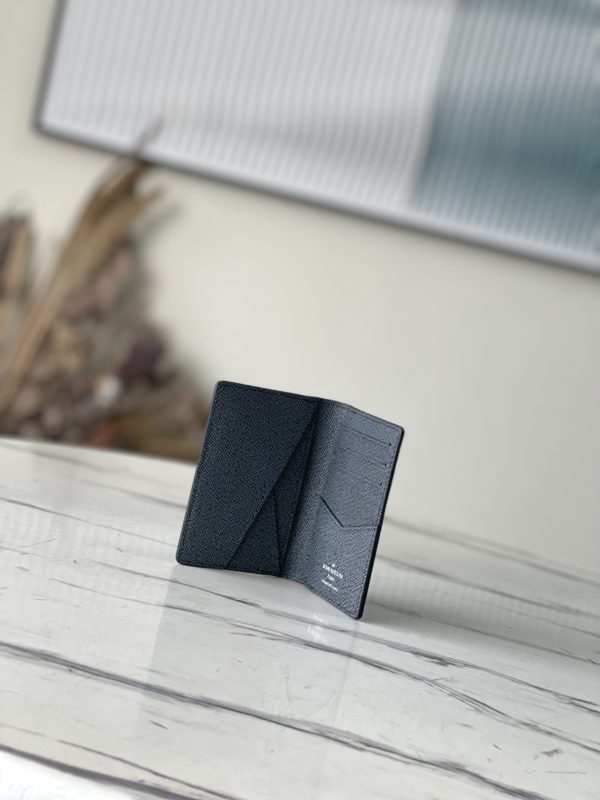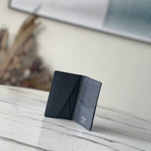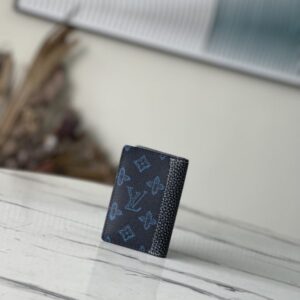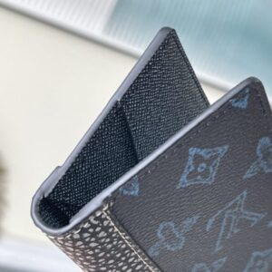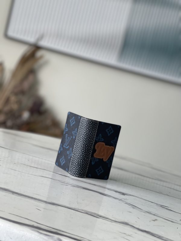 This pocket wallet wallet is made of canvas with a blue pattern on a dark background, the canvas is stitched with a leather patch in the shape of a logo with brown stitching, and the trim is presented with the same stitching . The wallet is compact enough to fit in most clothing pockets.