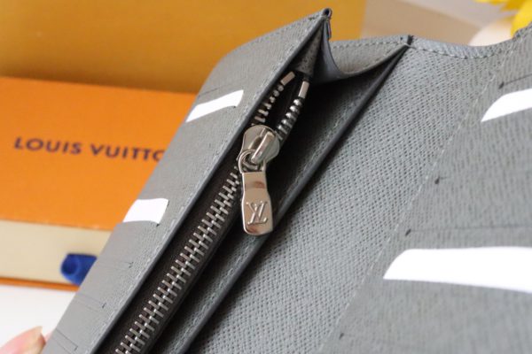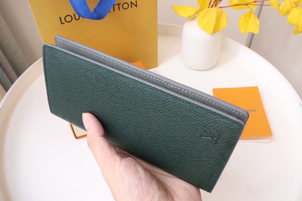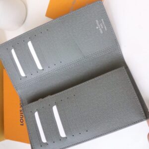 This stylish multifunctional wallet is crafted from Taiga leather in a discreet gray and black hue. The elegant design showcases textured leather and features practical details including multiple compartments for bills and receipts, a coin pocket and 17 card slots.