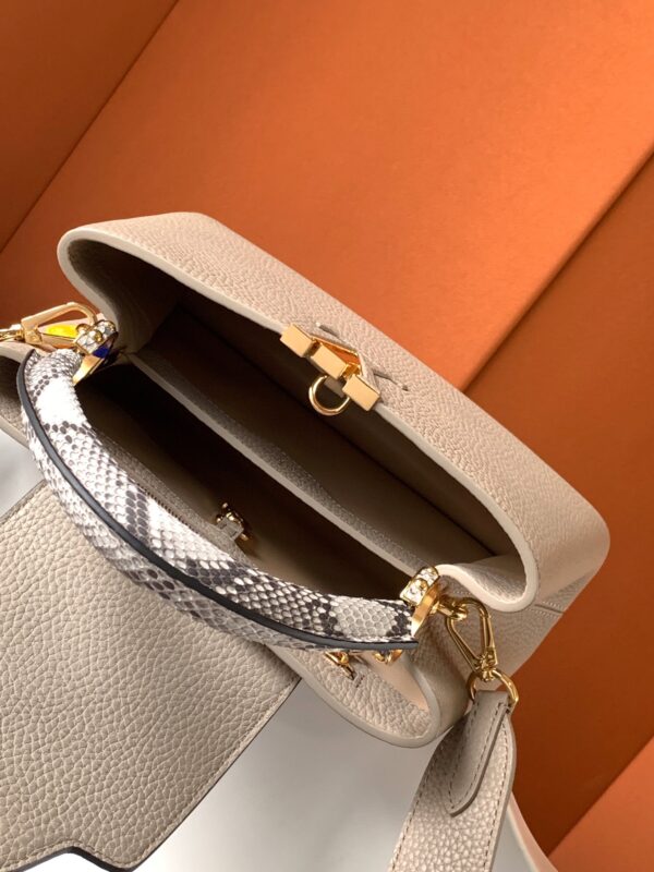 The Ca Bucines BB handbag is made of calfskin imported from France, with shiny metal accessories. The unique Ca Bucines cover can be stored inside the bag to display the letter logo, or can be turned outward to display the Monogram Flower pattern.
