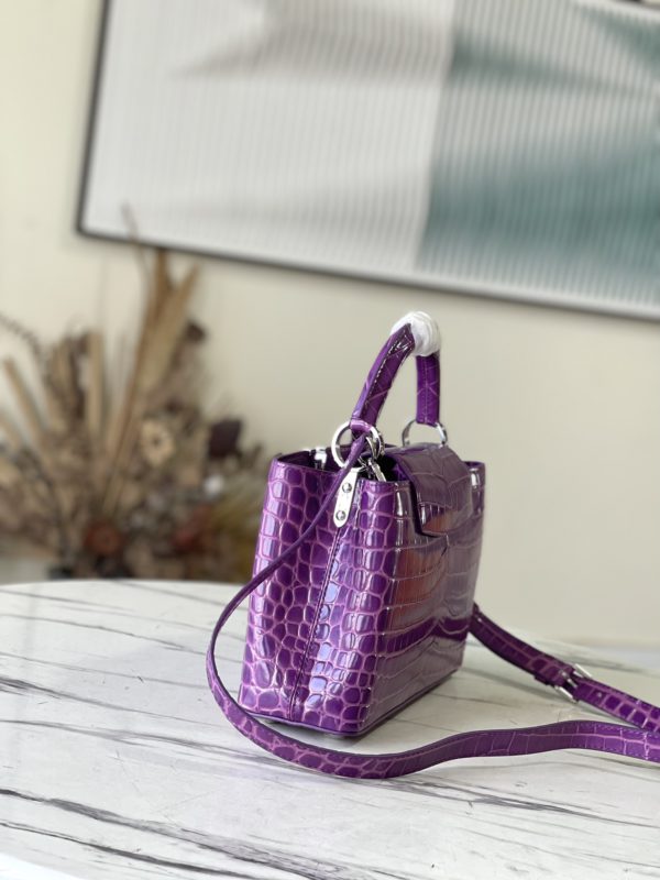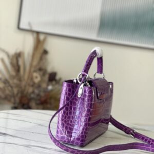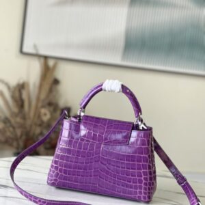 Purple crocodile silver buckle This precious Capucines BB handbag is made of crocodile leather with high-gloss treatment to shine. Luxurious goatskin lining and gleaming metal accessories. Unique Capucines flap can be included in the bag The letter logo is displayed inside and the Monogram Flower pattern can be turned inside out. Ideal accessories for night out.