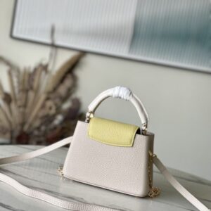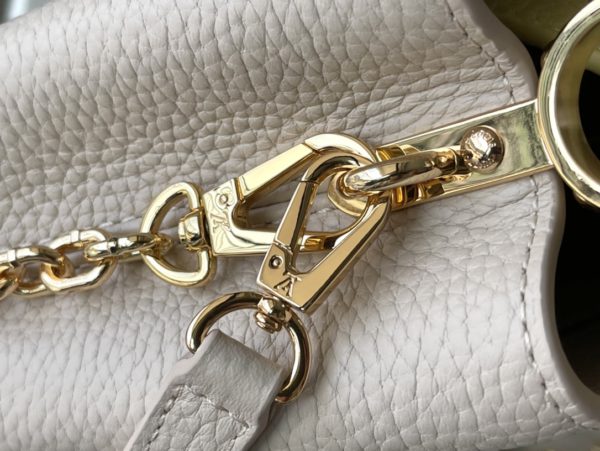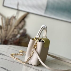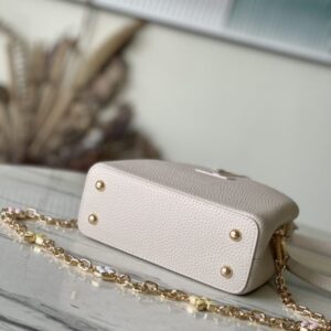 This Capucines handbag is made of Taurillon leather, which faintly reflects the shades of the same color, making the classic shape more eye-catching. Matched with the enamel Monogram floral chain, it can be carried by hand, on the elbow or on the shoulder strap.