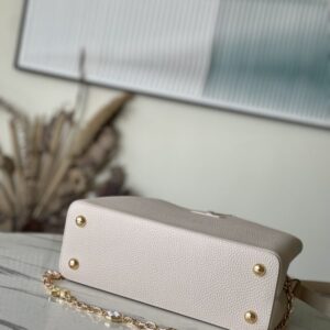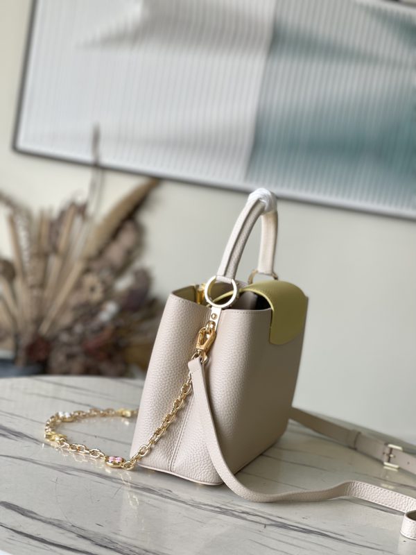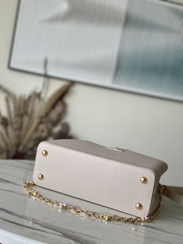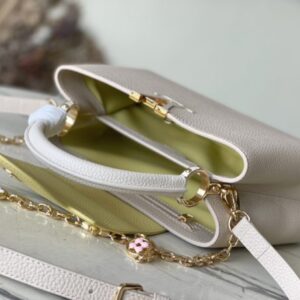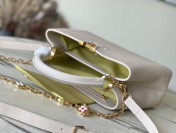 Yellow Color Matching Capucines Medium Handbag Shower New Season Baptism: Metal Monogram flowers are colored by hand polishing and glazing, and are connected in series by delicate chains. Use the detachable and adjustable slim shoulder strap to explore more ways to carry it.