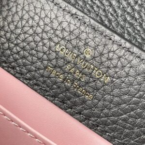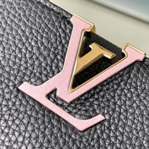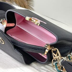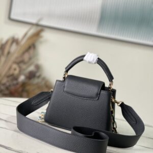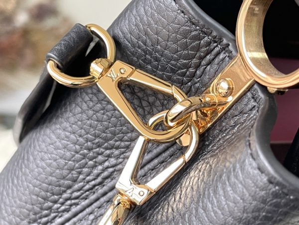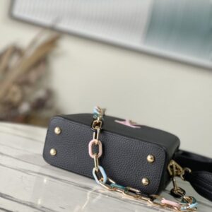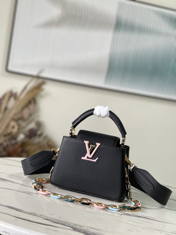 Black Mini This Capucines mini handbag has metal and resin links that interlock with each other, adding a twist to a classic design with a removable chain. Taurillon leather has a lustrous look, and the flap is placed on the inside to reveal the logo.