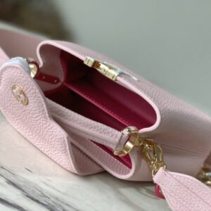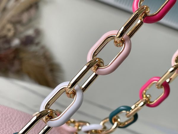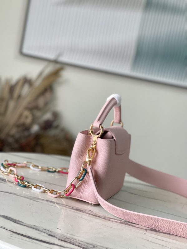 Pink Mini This Capucines mini handbag has metal and resin links interlocking for a playful twist on a classic design with a removable chain. Taurillon leather has a lustrous look, and the flap is placed on the inside to reveal the logo.