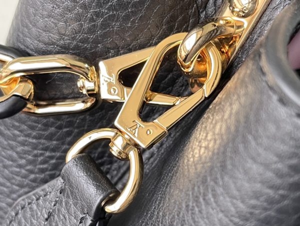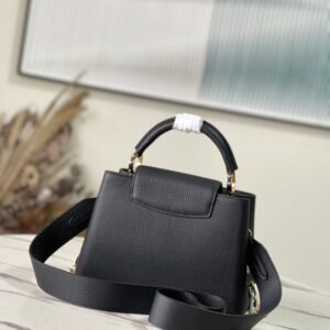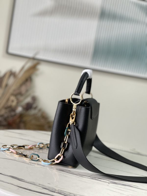 Black small This Capucines small handbag is made of Taurillon leather, the metal and resin links are interlocked with each other, and the top handle and detachable wide shoulder strap add a fun carrying method. The signature flap of the Capucines collection is folded in to reveal the logo.