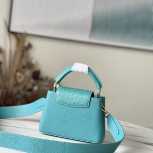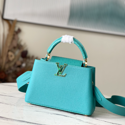Green This Capucines small handbag is made of Taurillon leather to shape the exquisite shape. The flap, handle and L letter are wrapped in ostrich leather. The flap can be placed outside or inside to read the L logo. The wide leather shoulder strap is detachable Full of modern style.
