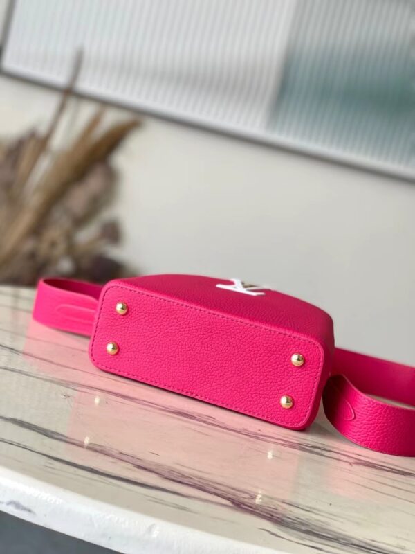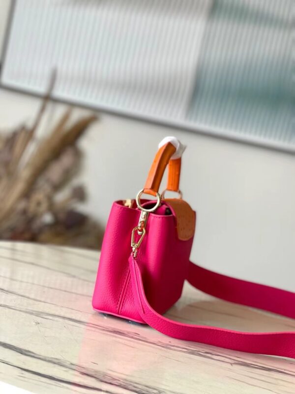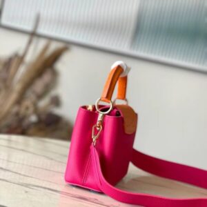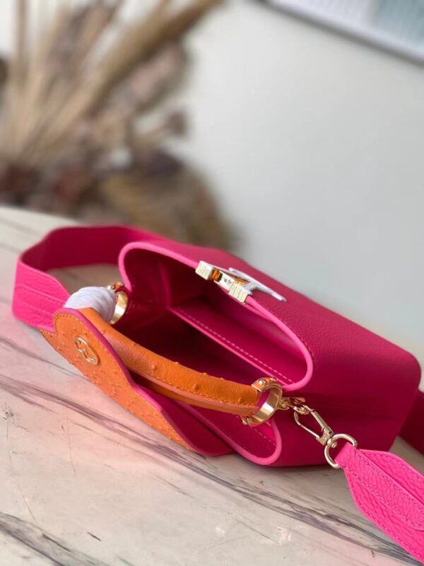 This Capucines handbag is made of Taurillon leather to create a delicate structure. The flap, handle and LV letter flap are wrapped with ostrich leather. The flap can be placed outside or inside to read the LV logo. The removable wide leather shoulder strap is full of modern fashion.