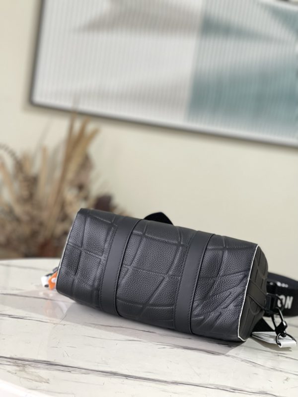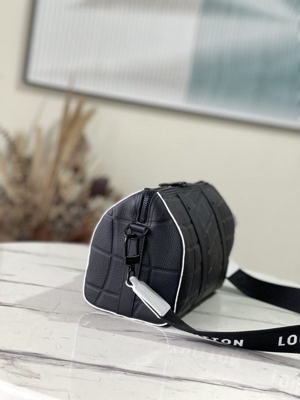 Black Men’s Bag Pillow Bag Collection CITY KEEPALL Handbag m21543 Gram Color (Letter) This City Keepall bag is made of Taurillon leather and is part of the 2022 FIFA World Cup capsule collection. The embossed pattern on the leather is reminiscent of the net used for goals. The bag is signed with the initials of LV in the same color, and it also has a leather nameplate shaped like a football team’s crest.