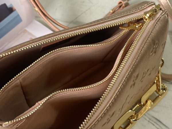 This Coussin BB handbag is cut out of soft Monogram embossed sheepskin with exquisite shape and gorgeous lining. The chunky chain and leather shoulder straps are detachable, and the interior compartment adds functional details, perfect for day or night.