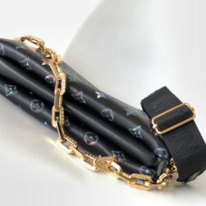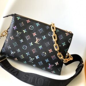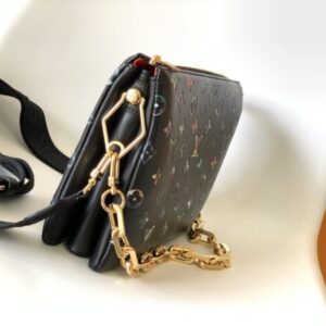 This Coussin small handbag is made of Monogram embossed sheepskin, which subtly integrates floral patterns into LV letters and Monogram flowers. Carry it on the shoulder by the chunky chain or attach the wide adjustable webbing strap to wear it cross-body.