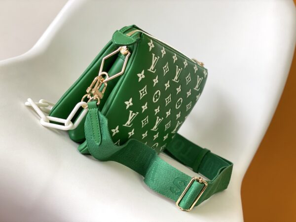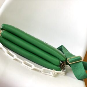 Coussin small handbag is from the Vuittamins capsule series. It is fluffy sheepskin embellished with rough chains, expressing Nicolas Ghesquière’s interpretation of confidence and joy in bright colors. Use the shoulder strap to wear it cross-body, as a baguette on chain or under the arm.