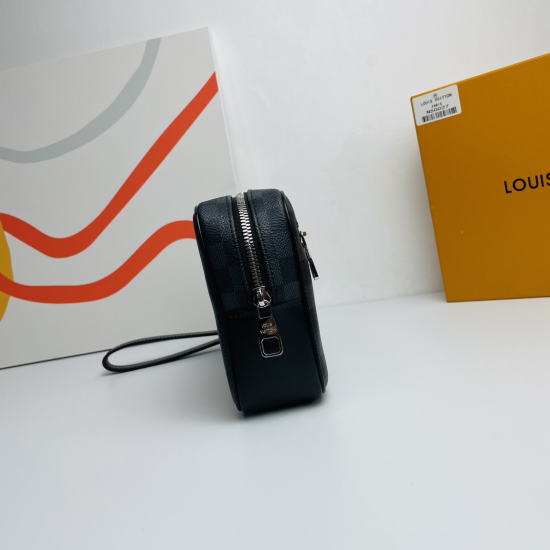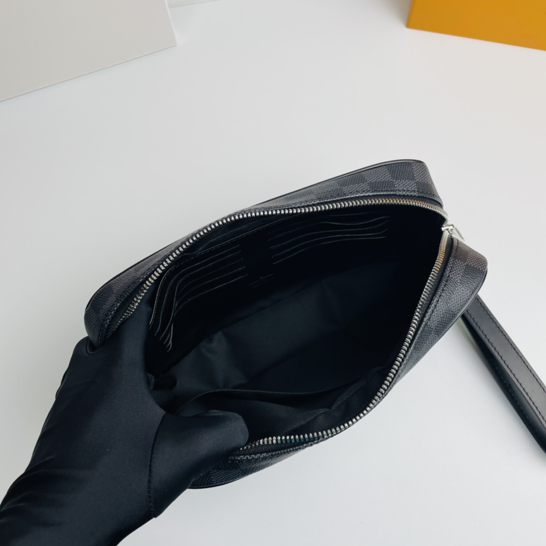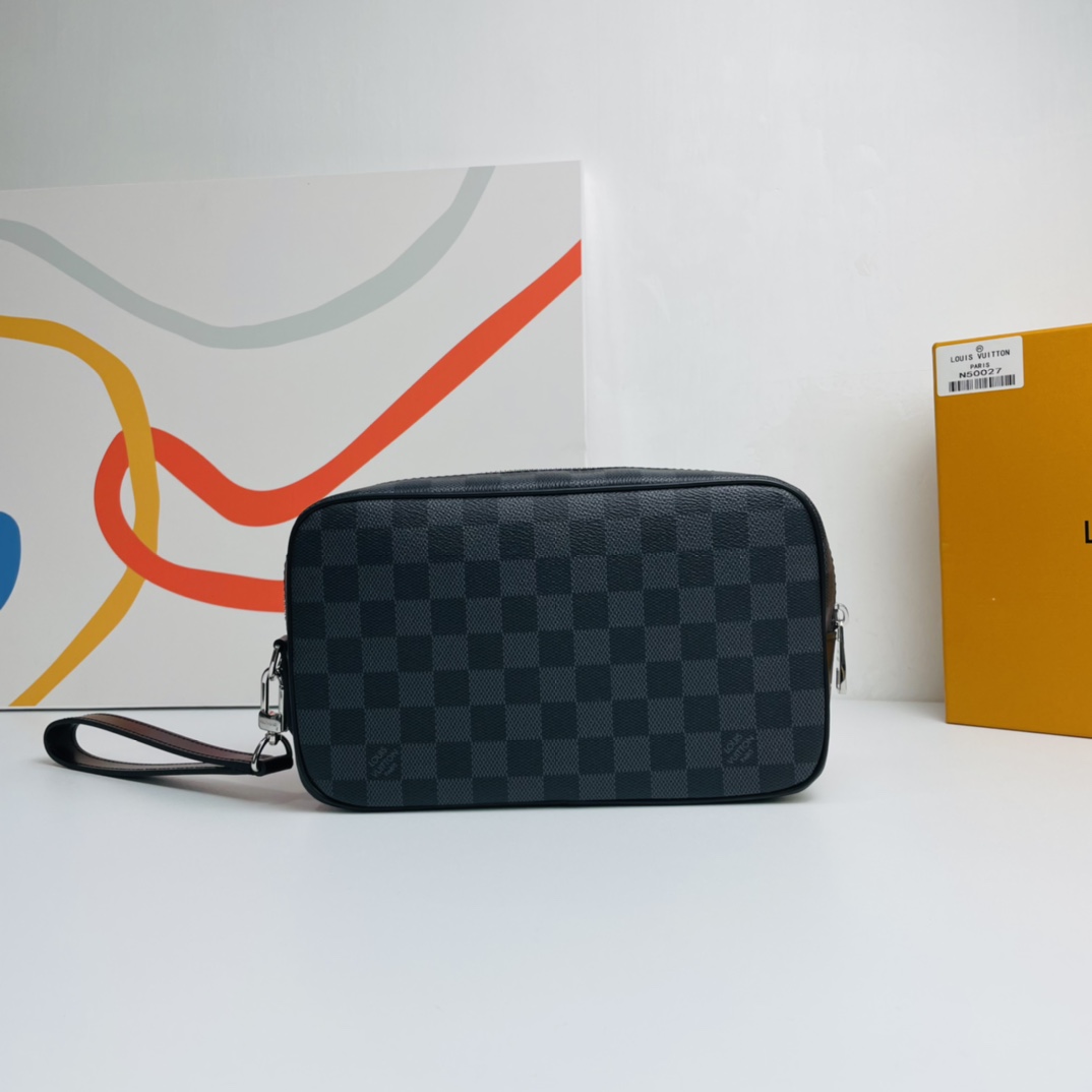 Wide zipper opening, abundant internal and external pockets and slots bring great practicality, this Kasai clutch in iconic Damier Graphite coated canvas can be clipped to the inside of the arm or worn on the wrist with the strap .