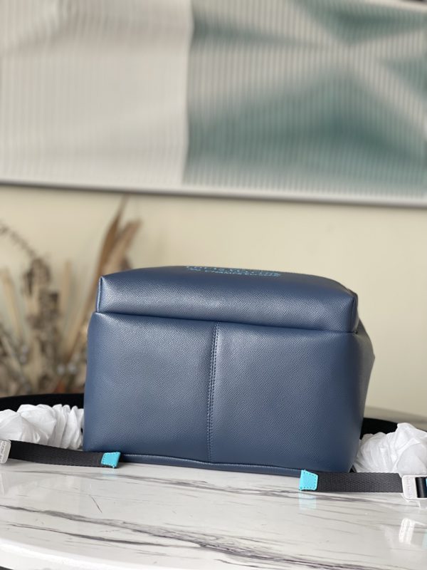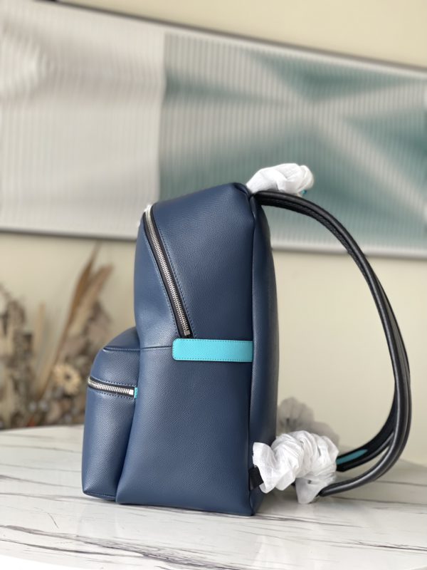 Discovery Backpack in dark dyed Taïga leather with stamp, dating back to the original 1875 label design inside the hard case. Three inner pockets add functional details, one of which can hold an iPad, and two adjustable leather shoulder straps create a comfortable carrying experience.