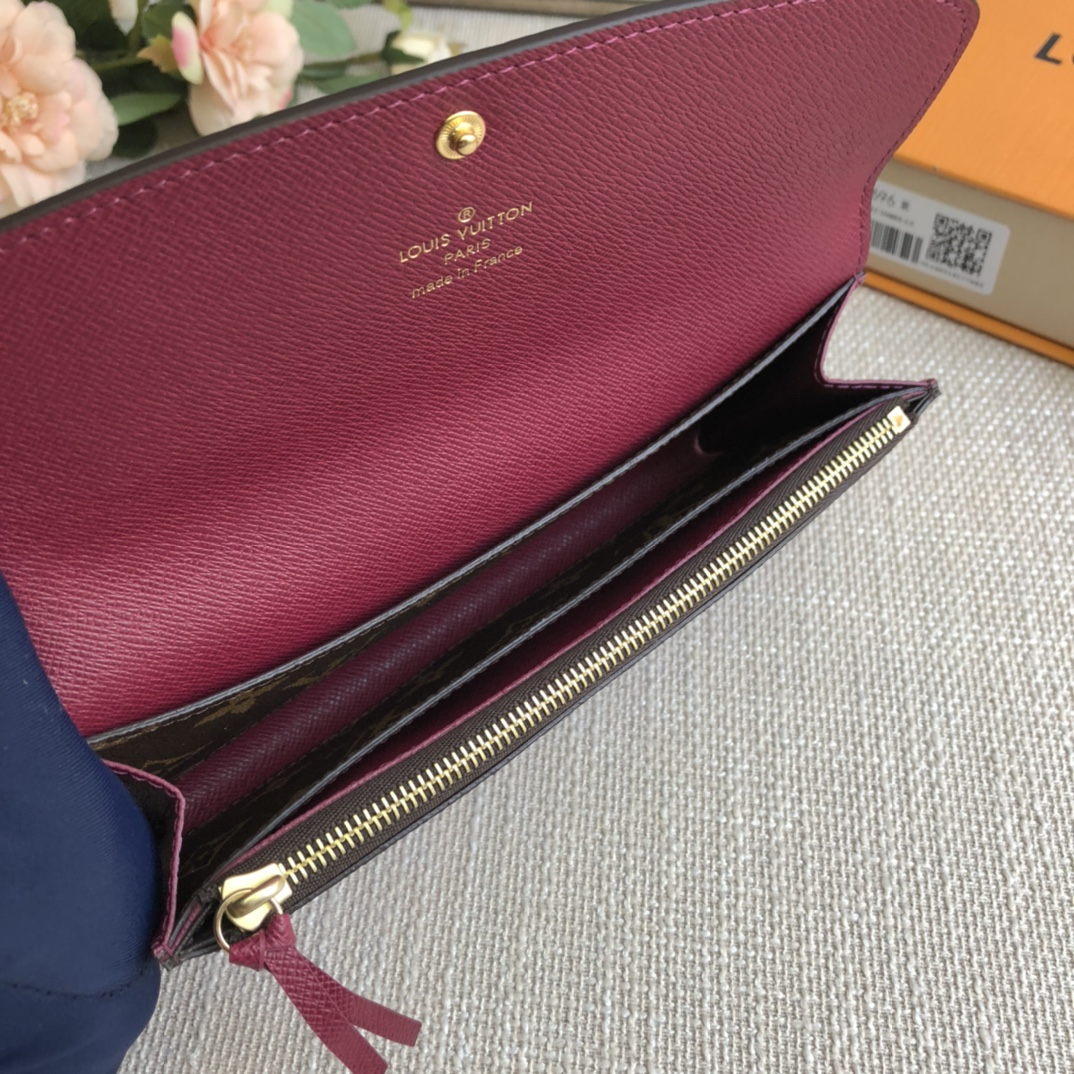 Purple red Doudou wallet exclusive real shot! Functional and richly designed, the Emilie Wallet is crafted in supple Monogram canvas with a vibrantly colored interior for ultimate elegance. The multi-pocket design and striking shape lend it irresistible allure.