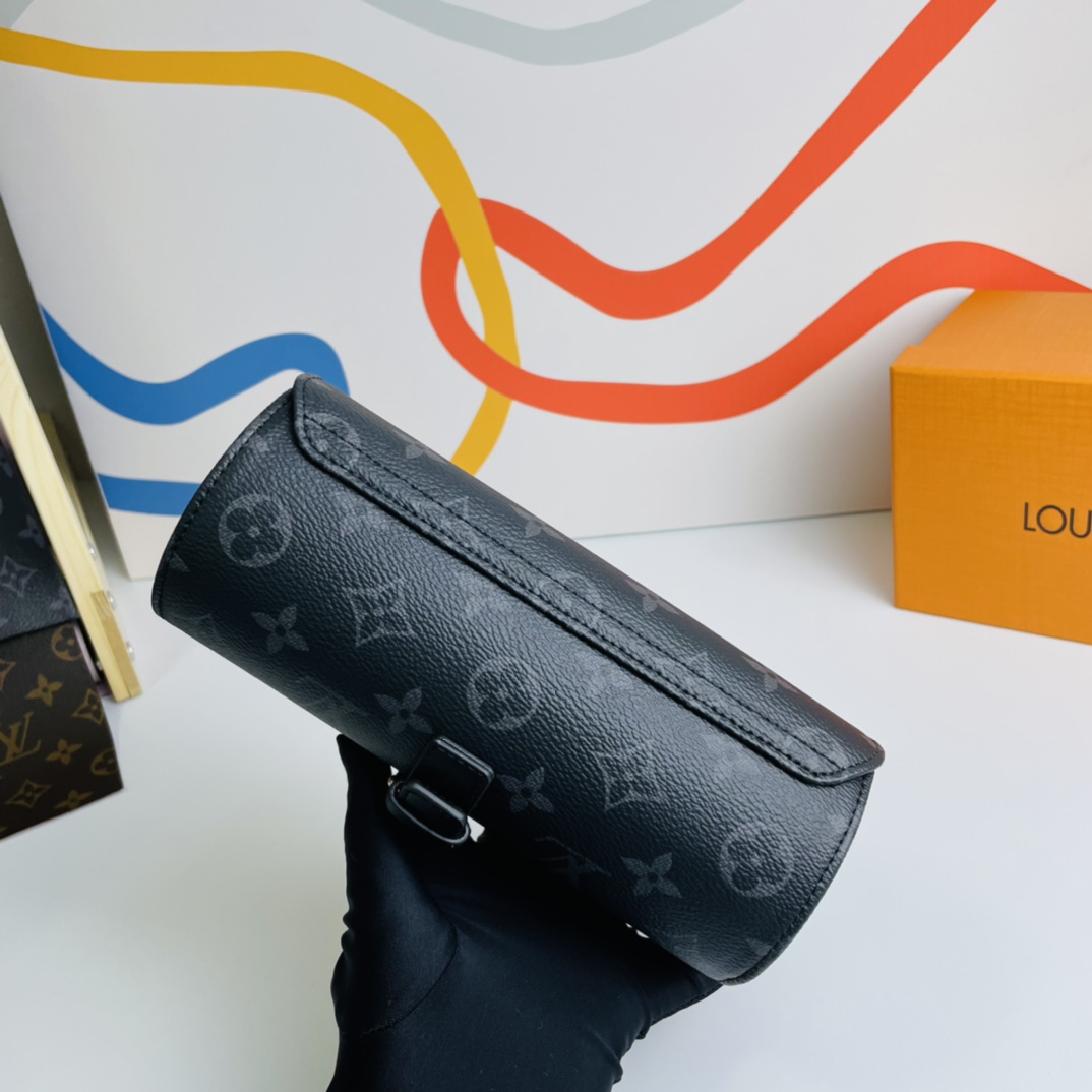 Exclusive real shot! This elegant watch case is crafted from sturdy Eclipse Monogram canvas and features a removable microfiber insert to securely store three watches. Leather strap and buckle design, safe and secure. Size: 20×8×8cm