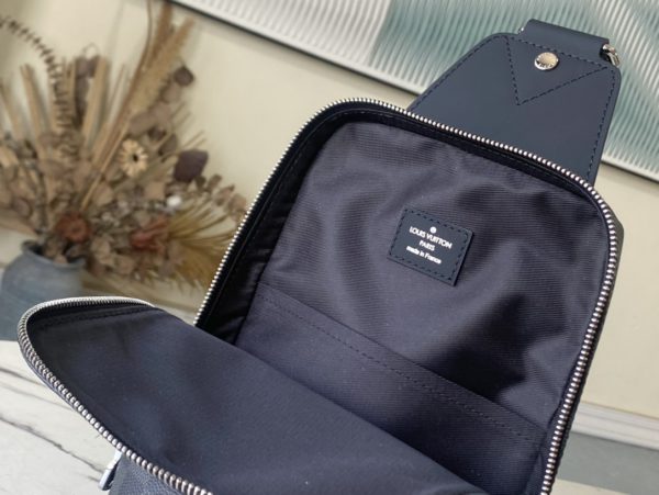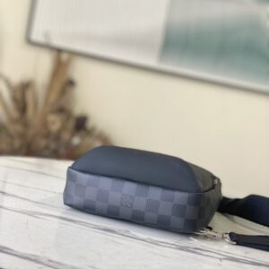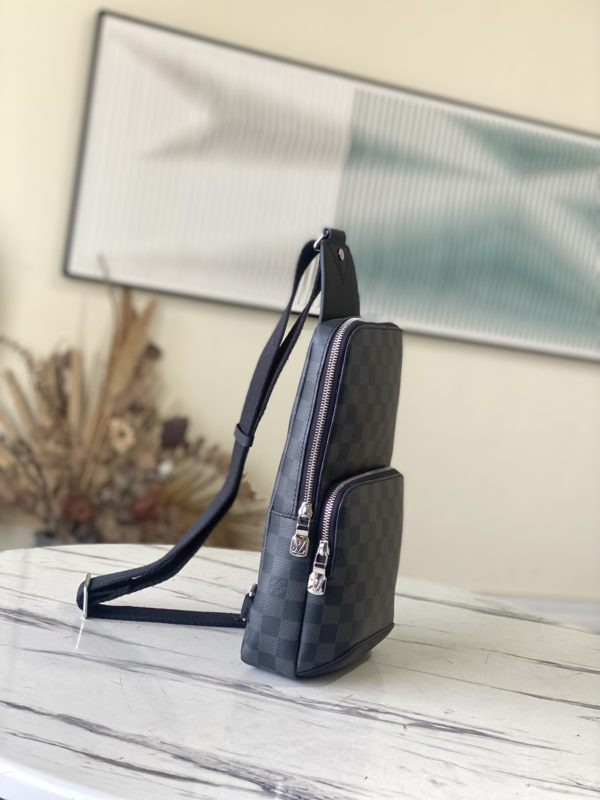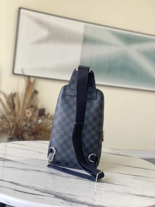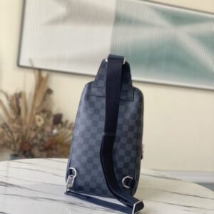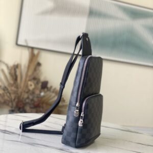 Black Grid AVENUE Shoulder Bag Chest Bag The Avenue Shoulder Bag in Damier Graphite canvas is the perfect companion for urban life. Small and stylish, it shows a casual and uninhibited attitude. The “smart” shoulder strap design fits on the left or right shoulder The double zipper closure on the back keeps valuables secure!