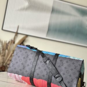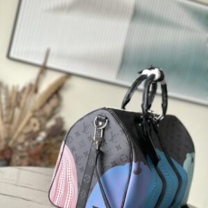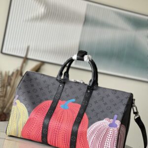 YK KEEPALL 45 travel bag Yayoi Kusama loved to depict pumpkins since she was a child, a symbol of warmth and comfort. The psychedelic pumpkin pattern is decorated with Monogram Eclipse Reverse canvas, another visual business card, and is also a collection choice.