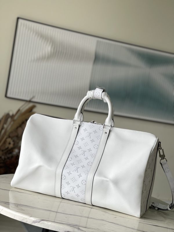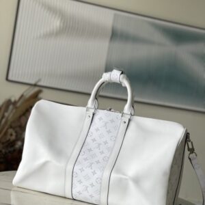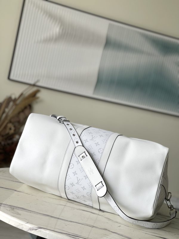 This Keepall 50 Bandoulière travel bag comes from the Taïgarama travel leather goods series, which incorporates the Monogram canvas structure on the front and sides of the Taïga calf leather body. Check-in luggage size with detachable and adjustable shoulder straps, zipped inner pocket and leather nameplate complete the overall design.