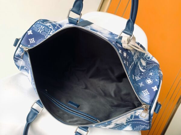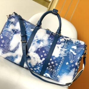 Keepall Bandoulière 50 soft travel bag meets the chic bleaching effect of the Monogram Bandana pattern, making the soft leather and classic lines reveal calm and elegant. The carry-on size includes plenty of room to easily accommodate weekend trips. The top leather handle and detachable shoulder strap allow for a variety of carrying options. detailed features.