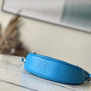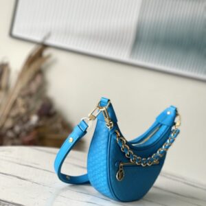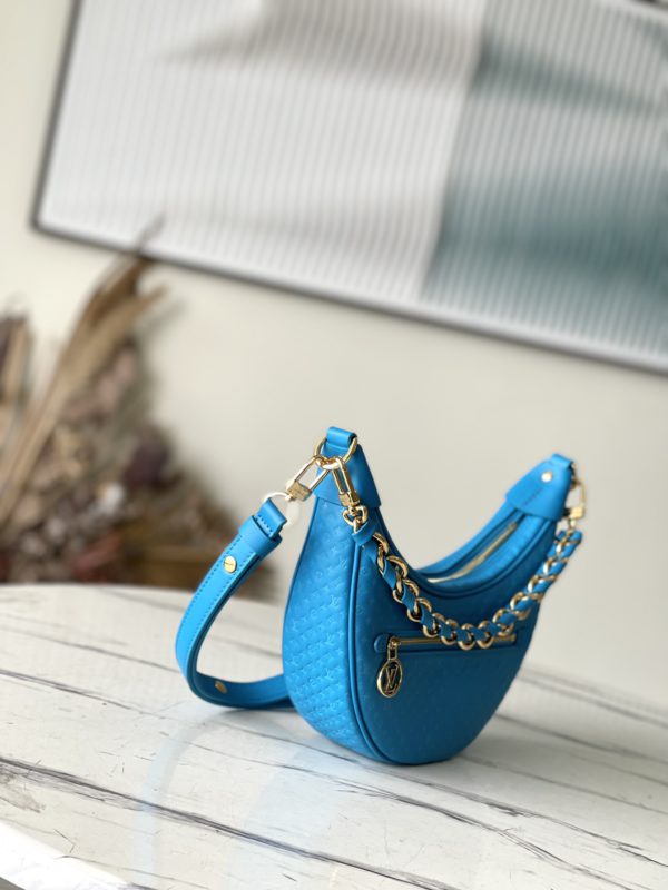 Blue Loop bag in calf leather with Monogram pattern in miniature. The colorful silk-screened lettering and Monogram floral pattern gently contrast with the body of the bag. The chain and signature Circle zip pull have a bright finish.