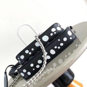 Louis Vuitton once again joined hands with Yayoi Kusama to inject new interest into this LV x YK Multi Pochette Accessoires handbag. The pattern of polka dots of different sizes is paved with Monogram embossed calfskin leather, reproducing the iconic elements in the works of the Japanese artist. The pumpkin-shaped decoration indicates another visual calling card of Yayoi Kusama.