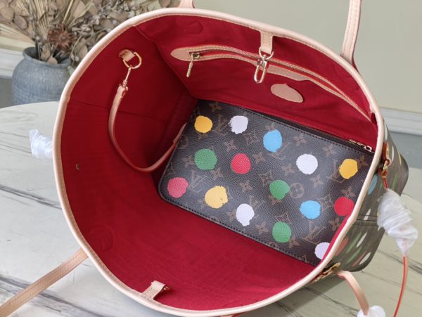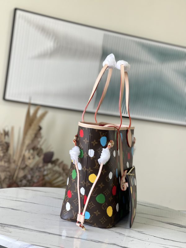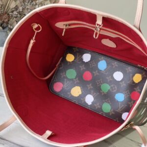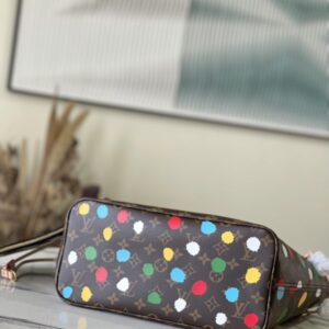 This LV x YK Neverfull medium-sized handbag selection x Yayoi Kusama cooperation series hand-painted effect polka-dot printing, reproducing the visual business card of this famous Japanese artist on Monogram canvas. The complex silk screen printing process creates a three-dimensional texture, which makes the functional design burst with vitality.