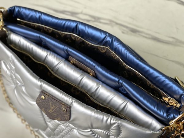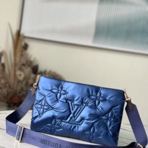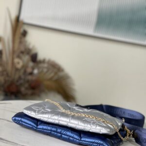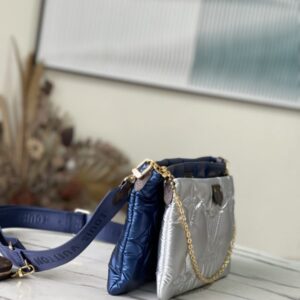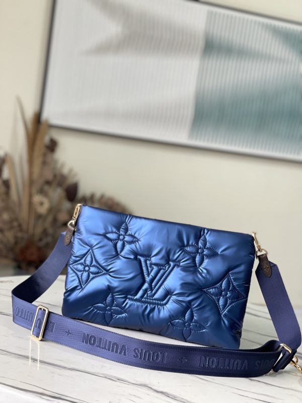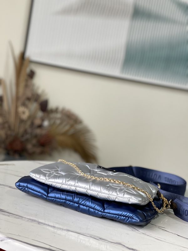 Silver/Blue Maxi Multi Pochette Accessoires Bag in Econyl Recycled Nylon. It has a Monogram embroidered exterior for a fluffy cushioned feel and a Mini Monogram printed Econyl lining. Featuring multiple pockets and compartments, it brings together the Pochette Accessoires clutch, Pochette Accessoires mini clutch and round coin purse in one place.