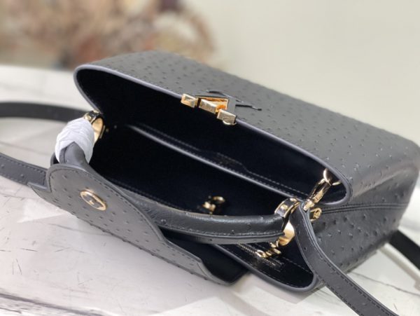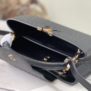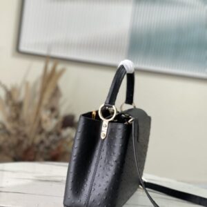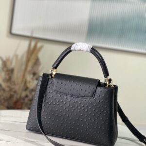 Medium-sized Capucines ostrich leather handbag with black ostrich pattern, moderate hardness handle, gorgeous buckle connecting the handle, spacious and practical shape, etc. The drop cover can be used in two ways, and it can be placed outside the bag to show the fashion trend of the Monogram flower pattern.