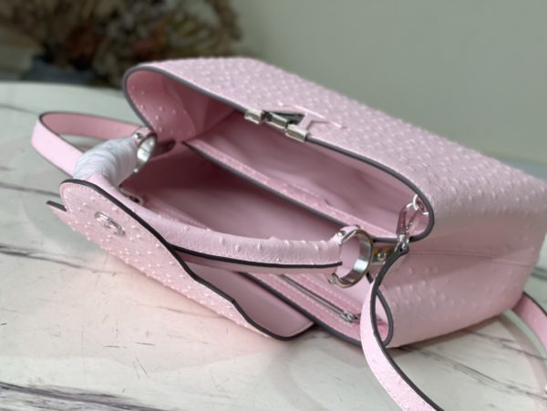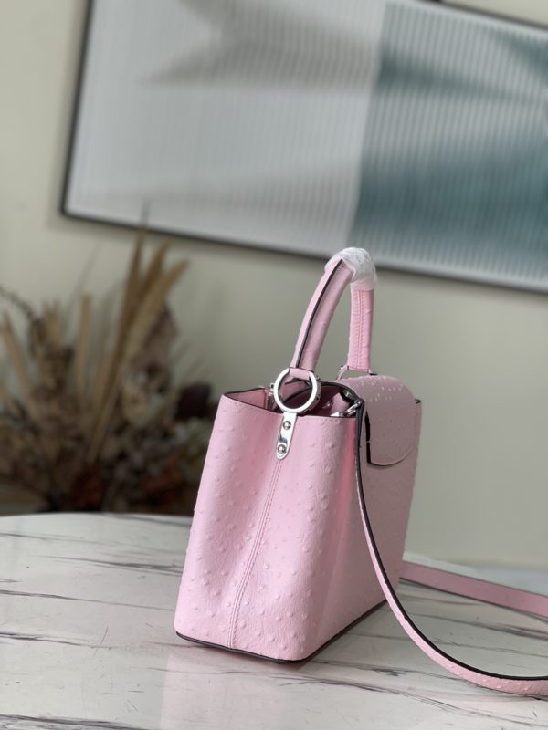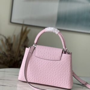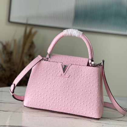 Light pink medium-sized Capucines ostrich leather handbag, moderate hardness handle, gorgeous buckle connecting the handle, spacious and practical shape, etc. The drop cover can be used in two ways, and it can be placed outside the bag to show the fashion trend of the Monogram flower pattern.