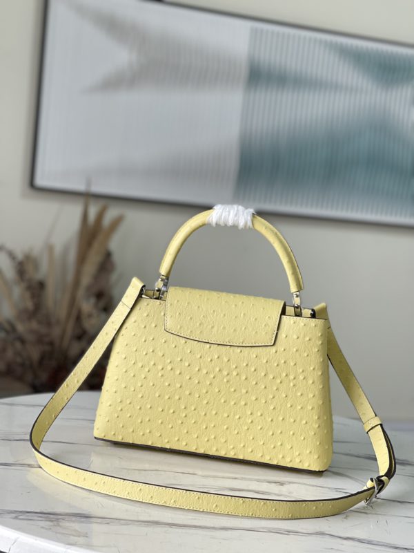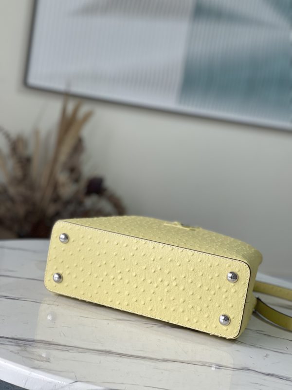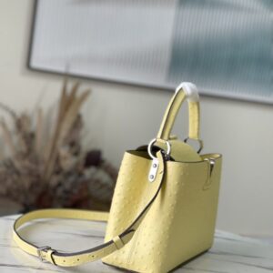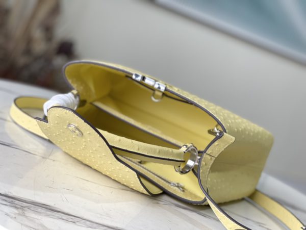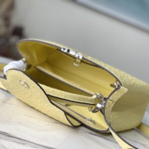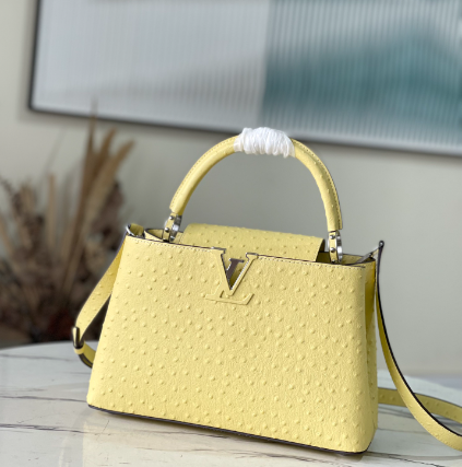 Yellow medium Capucines ostrich leather handbag, moderate hardness handle, gorgeous buckle connecting the handle, spacious and practical shape, etc. The drop cover can be used in two ways, and it can be placed outside the bag to show the fashion trend of the Monogram flower pattern.