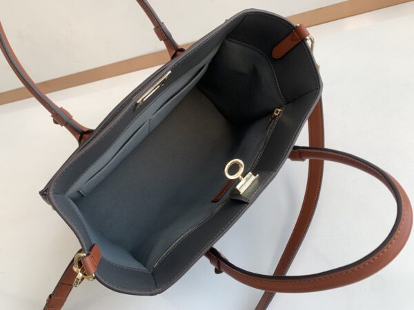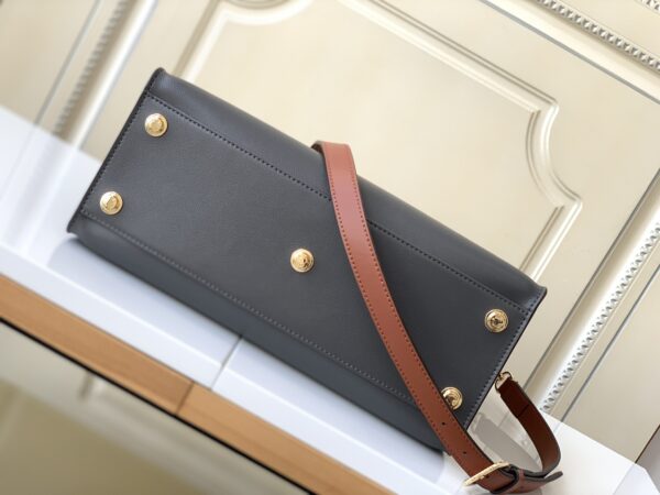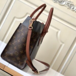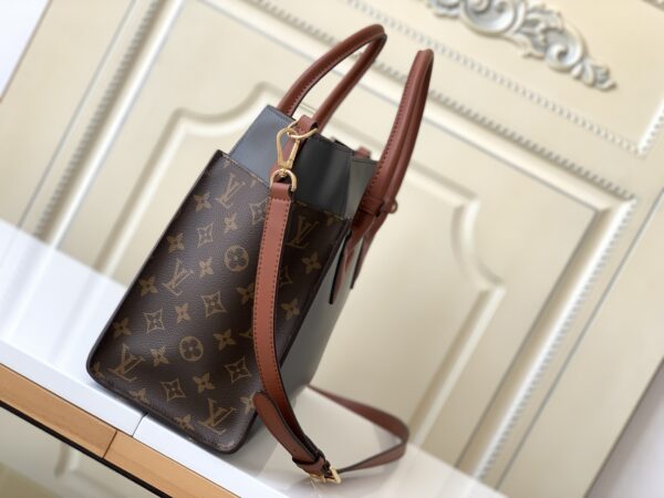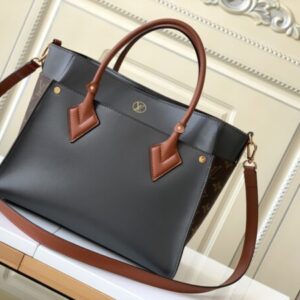 The On My Side bag presents an elegant blend of calfskin and classic Monogram canvas. Contrasting canvas frames the oversized outer pocket, creating a trompe l’oeil effect of two bags blending into one. There’s plenty of room to easily accommodate your office needs, and the adjustable shoulder strap allows for cross-body styling. Detailed size: 30.5×24.5x14cm