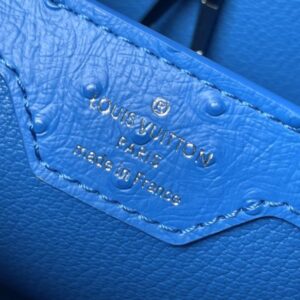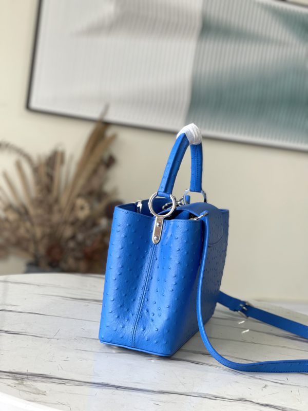 Medium-sized Capucines ostrich leather handbag with blue ostrich pattern, moderate hardness handle, gorgeous buckle connecting the handle, spacious and practical shape, etc. The drop cover can be used in two ways, and it can be placed outside the bag to show the fashion trend of the Monogram flower pattern.