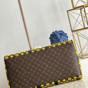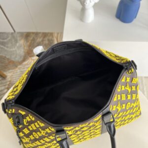 ellow Flocked Travel Bag Series Louis Vuitton Men’s Artistic Director Virgil Abloh interprets classic travel bags with interesting geometric shapes, creating a yellow Monogram Tuffetage canvas version of the Keepall Triangle BANDOULIÈRE 50 travel bag. The triangular shape is complemented by a pair of smooth leather top handles and side straps that complement the yellow Monogram embroidered background. This travel bag holds a variety of travel essentials.