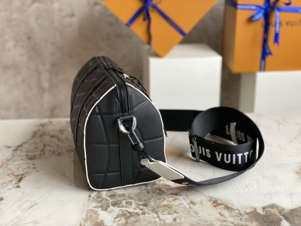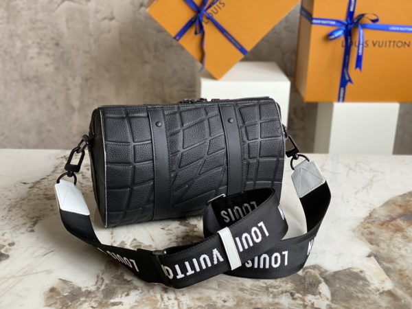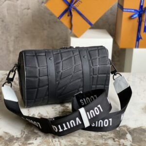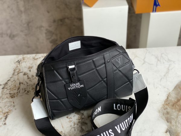 Black men’s bag pillow bag series CITY KEEPALL handbag m21543 gram color (letter) This City Keepall bag is made of Taurillon leather and is part of the 2022 FIFA World Cup capsule collection. The embossed pattern on the leather is reminiscent of the net used for goals. The bag is signed with the initials of LV in the same color, and it also has a leather nameplate shaped like a football team’s crest.