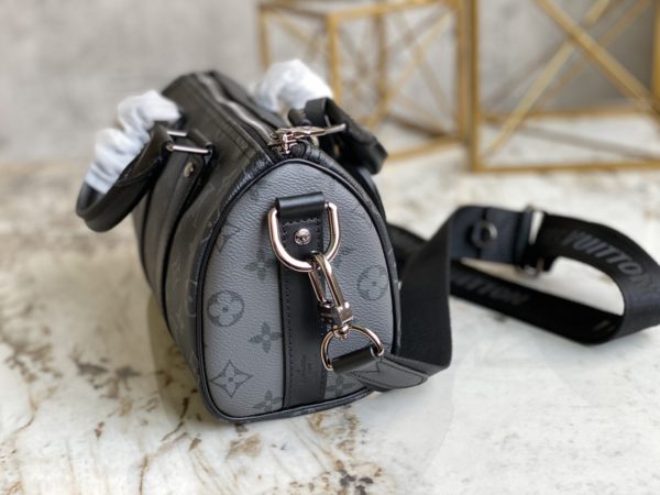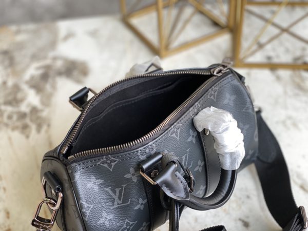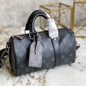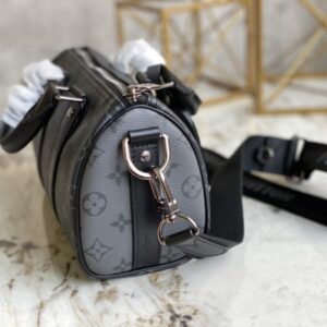 Black flower men’s pillow bag series This Keepall 25 handbag is made of Monogram Eclipse Reverse canvas, showing the elegant reinterpretation of Louis Vuitton’s classic patterns. Reinforced straps and a leather nameplate continue the Keepall collection’s signature elements, while a zip closure keeps personal belongings secure.