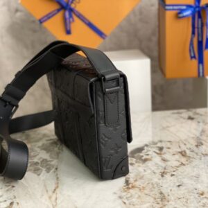 Black full leather men’s messenger bag series This small cuboid Trunk messenger bag is made of Monogram embossed Taurillon leather, continuing the brand’s classic hard case elements such as rivets and reinforced leather corners. Detachable, adjustable strap for comfortable carrying.