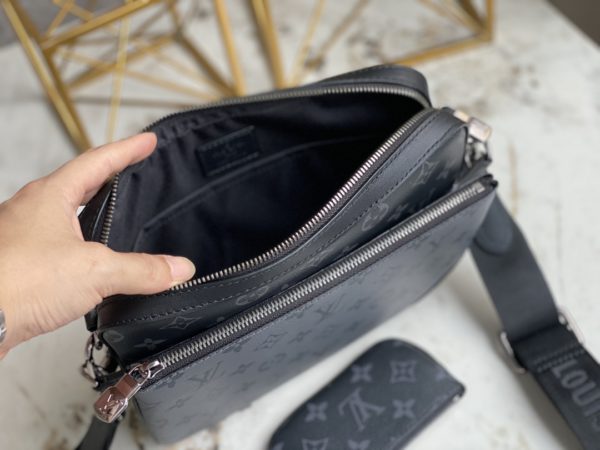 Black flower men’s three-piece Pochette Trio messenger bag series Pochette men’s three-in-one handbag is made of two classic canvases, and the iconic tone-on-tone gray pattern highlights the lines of this multifunctional design , in addition to the functions of a traditional messenger bag, it is also equipped with a detachable zipper bag and a coin purse attached to the strap.