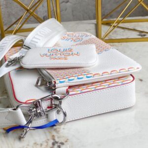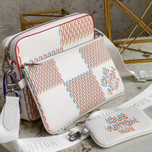 Men’s three-piece white grid full leather suit series 2022 The new Trio messenger bag releases the trendy charm of Damier Spray elements. Louis Vuitton’s iconic Damier motif is dramatically magnified and reflected in 3D, while smooth and grained calfskin create multiple structures, including a detachable front pocket and coin purse on the shoulder strap, creating streetwear for Damier lovers.