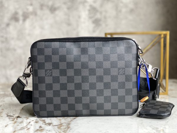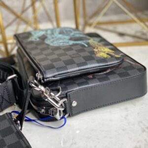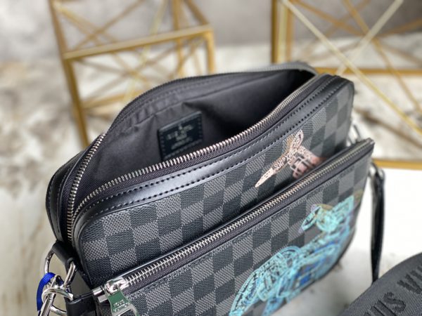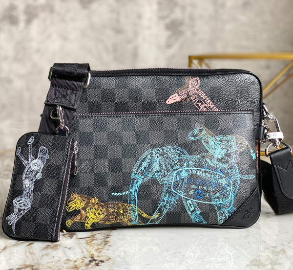 Heiger silk screen printing men’s three-piece series TRIO messenger bag N58040 Heiger (silk printing) This Trio messenger bag depicts wild animals on the surface of Damier Graphite canvas, and it can be seen from a closer look that it is made of a pattern that resembles a passport stamp composition. A zipped main compartment, a detachable small clutch and a coin purse attached to the adjustable shoulder strap provide three functions in one.